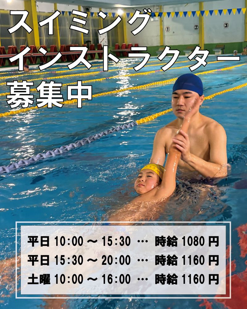 アピールポイント: ①未経験でも安心 研修制度があるので、未経験の方でも安心してスタートできます。先輩スタッフが丁寧にサポートします。 ②子供の成長を感じられる仕事 「泳げた!」「できた!」という瞬間に立ち会える、やりがいがあるお仕事です。 ③学生・主婦スタッフ活躍中 大学生・専門学生・主婦など、多く活躍しています。友達同士の応募も大歓迎です。 ④シフト相談OK 学校や家庭の予定に合わせてシフト調整が可能です。無理なく働けます。 ⑤運動不足解消にも◎ 空いた時間を使ってプールで泳げます。 ⑥水泳が好きな方にピッタリ 泳ぐことが好きな方やスポーツが好きな方におススメです。