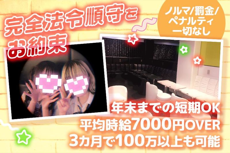 【保険制度】 雇用保険、労災保険、健康保険、厚生年金 待遇・福利厚生 【福利厚生】 多くのお店を経営している優良企業だから 違法行為やグレーなことは一切ありません! ナイトワークが初めての方でも安心! ✅日払いOK ✅自由シフト(週1~OK) ✅更衣室・鍵付き個人ロッカー完備 ✅店内・更衣室フリーWi-Fi使い放題 ✅時給完全保証 ✅ヘアメイク無料完備 ✅無料送りあり ✅可愛い制服無料レンタル ✅罰金・ノルマなし ✅1日体験入店OK ✅入店祝い金MAX20万円※条件あり ✅友達紹介料MAX10万円※条件有 ✅ナイトデビュー!業界未経験でもOK ✅経験のある方は各種優遇あり ✅Wワーク大歓迎 ✅終電あがりOK ✅3h以内の勤務OK ✅土曜日、日曜日営業あり ✅お酒が飲めなくてもOK ✅全12種類の高額バックあり ✅各種手当多数あり