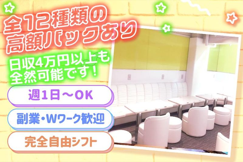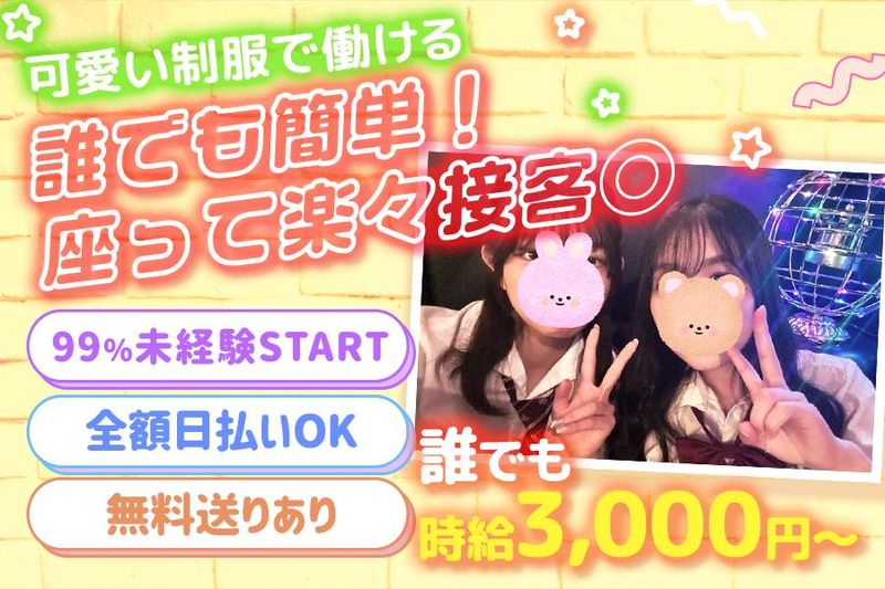 時給3,000円以上 給与詳細 基本給:時給 3000円 〜 【働きやすい条件多数あり】  ̄ ̄ ̄ ̄ ̄ ̄ ̄ ̄ ̄ ̄ ̄ ̄ ̄ ✅入店だけで20万プレゼント ✅さらに友達紹介で10万円 ✅お給料は日払いOK/手渡しOK ✅広範囲への送りOK ✅3カ月で100万稼げるかも! など嬉しい条件多数! ⭐全12種のバック制度あり ◆ドリンク・ボトル・フード ◆本指名・場内指名・同伴・ブログ など! だから時給以上の収入も狙えます! 努力した分がお給料に反映されるから、 やる気とモチベもUP!! 今いるキャストの平均時給は7000円OVER その他にも ✨交通費支給(面接交通費) ✨昇給あり ✨ノルマ・罰金なし! ✨時給保証あり ✨ヘアメイク無料 ✨衣装レンタル無料 ✨待機中も時給発生 ✨履歴書不要 ✨Wi-Fi完備 ✨バックヤード完備 ✨待機室完備 など嬉しい条件多数あり! 体験入店は何回でも大歓迎⭐⭐  ̄ ̄ ̄ ̄ ̄ ̄ ̄ ̄ ̄ ̄ ̄ ̄ ̄ ̄ 体験でやってもらうことは、 ✅簡単なお酒作り ✅かわいい制服でお客さんとお話し 以上!です!! 楽しく、体験してみてください! 未経験専門店としてお店を運営してるので、 初心者さんでも安心してくださいね♪ ソフドリも豊富でお酒が得意じゃなくても大丈夫♪ 『体験入店のステップをご紹介します♪』 【1】お店に到着☆ ↓ 【2】かんたんな面談&お仕事の説明 ↓ 【3】オープン♪お客様をお迎えします ↓ 【4】ドリンク作りやお話しタイム♪ ↓ 【5】お給料を受け取って、そのまま帰宅! 1人で不安だな... そんな方はお友達と一緒でも大歓迎! 学校終わり・仕事おわりに気軽に来てください✨ 【給与例】 給与例 ⭐短時間、短期間でガッツリ稼ぐことも可能です⭐ ✅ドリンクバック ✅フードバック ✅ボトルバック ✅その他バック など全12種のバックが充実✨ ナイトワーク未経験の方でも たくさん稼げます♪ 【実際の1日の給与例】※6時間勤務 時間給:27,000円 ドリンクバック:6,200円 フードバック :3,500円 ボトルバック :10,000円 その他バック :5,000円 合計:51,700円 ※実質時給:8,616円
