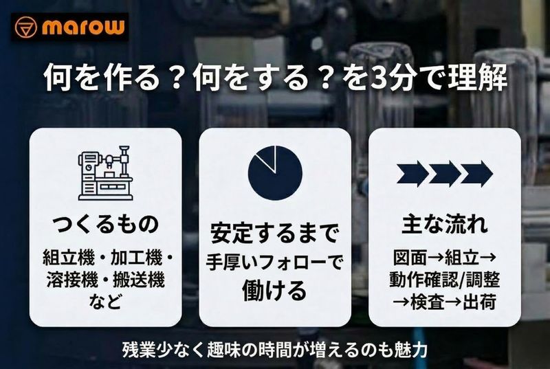 求めている人材 ■学歴不問 ■未経験歓迎 ■普通自動車免許(AT限定可) ≪歓迎経験≫ ・機械加工、機械組立、配線の何らかの経験がある方 ・当社の多能工化方針を理解してくれる方 ・どんな状況にも柔軟に対応できる方 ・モノづくりに関心があり、前向きに取り組む未経験の方 弊社で培われた技術の習得には一定期間はかかりますが、現場で先輩から学べる機会は幾らでもあります。創業から培ってきたあらゆる技術や知識が結集された本物の技術にぜひチャレンジください♪