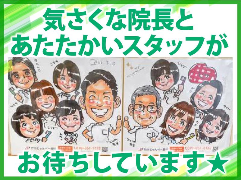 仕事内容 ✅口腔外科をメインに行う歯科医院! ✅結婚や育児でブランクがある方もOK! ✅週1日~、午前診のみの勤務もOK! ✅家事や子育ても両立できる職場! ✅扶養内・Wワークなども柔軟に対応! 当院は、歯周病治療・口腔外科を軸に 『治すための治療』を重視した歯科医院です。 親知らずの抜歯や歯周外科治療をはじめ、 セラミックやインプラントを用いた治療など 幅広い歯科治療を行い、 地域社会への貢献に努めています。 今回は、そんな当院で 患者様の治療を一緒に診ていける 【歯科衛生士】のアルバイト・パートの募集です。 ======== ▼基本予約制で落ち着いて勤務できる!  ̄ ̄ ̄ ̄ ̄ ̄ ̄ ̄ ̄ ̄ ̄ ̄ ̄ ̄ ̄ ̄ 当院では、すべての診療を 基本的には予約制で行っているため、 患者様に十分な時間を確保して、 じっくりと向き合うことができる環境です。 特に定期健診は1回40~70分と、 余裕を持つことで焦ることなく、 患者様一人ひとりに適切な治療を提供。 流れ作業のように診療を進めることはなく、 状態に合わせた丁寧な診療を行うため、 患者様に安心感を与えながら 丁寧に治療を進めることができます。 また、カルテの記入なども 診療の合間に行うことができるため、 診療後に慌てて書き直すことがなく、 効率的に進められる診療体制です。 ▼週1日~、午前診のみの勤務もOK!  ̄ ̄ ̄ ̄ ̄ ̄ ̄ ̄ ̄ ̄ ̄ ̄ ̄ ̄ ̄ ̄ 勤務は週1日~、午前診・午後診のみなど 柔軟な働き方ができるので、 家事や子育てと両立したい方にピッタリ! 働き方も柔軟に対応しており、 『週〇日働きたい』『扶養内で無理なく』 など、面接の際に気軽に相談してください! ======== 【仕事内容詳細】 ・歯周病のメンテナンス ・歯周外科治療 ・定期健診(1回40~70分) ・ブラッシング指導、染め出し検査 ・診療補助、カルテ作成 ※往診なし ※ノルマなし ※チェア4台(3月より5台に増設予定) 患者さんは幅広い年代の方が来院されますが 治療を目的に遠方から通われる方も多く、 治療を前提とした検査・指導が主となります。 「患者さんに寄り添う」だけでなく、 必要なことを、必要なタイミングで伝える そんな診療スタイルを大切にしています。 ▼当院について  ̄ ̄ ̄ ̄ ̄ ̄ ̄ ̄ ̄ ̄ ̄ ̄ ̄ ̄ ̄ ̄ 現在、 衛生士3名(40代2名・20代1名)、 助手3名(40代1名・30代1名・20代1名)、 歯科技工士1名(60代)、 医師(院長30代・前院長70代)が在籍中。 院長は、勉強熱心で優しく、 スタッフとの関係も大切にしながら、 みんなの成長を応援してくれる方。 スタッフのお誕生日には、 毎年お花をプレゼントしてくれます◎ それぞれの性格や雰囲気を考慮して、 「〇〇さんは赤のお花がいいな」 「明るいオレンジがいいな」 「派手すぎない緑色がいいな」 など、ひとりひとりにぴったりの お花を選んでくれているそうです◎ 院内には、リニューアルオープンの際に 似顔絵師に描いてもらった 院長の似顔絵も飾られています◎ また、スタッフみんなで定期的に飲み会も開催。 (もちろん自由参加!お酒が苦手な方も安心です♪) 院長・スタッフみんなとても気さくで 温かく居心地の良い雰囲気のクリニックです。 ★まずはお気軽にお問合せください! ⏩https://takeuchi-jpdc.jp/ ⏩078-851-3132