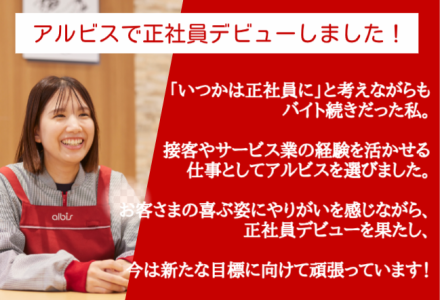 仕事内容 「アルビス」は富山県発祥、北陸エリアにて 売上シェアNo.1を誇るスーパーマーケットです。 店舗展開の勢いも加速中で、情報番組で取り上げられるなど、 メディアで話題沸騰中!! ✅中途採用初!説明会随時開催中! ✅第二新卒・未経験大歓迎! ✅上場企業ならではの安定基盤! ✅賞与は年4.5ヵ月分!週休2日制! ✅奨学金返済支援制度あり ✅転居を伴う異動なく安心! ✅女性が活躍できる証の「えるぼし認定」最高ランクを取得 ✅ワークライフバランス◎安心して長くご活躍いただけます! ✅入社祝い金!(規定あり) └総合職(転居を伴う異動あり)10万円 └一般職(転居を伴う異動なし)3万円 【仕事内容】 スーパー「アルビス」の店舗スタッフとして働いていただきます! 勤務地(配属店舗や部門)は希望と適性を考慮の上、決定いたします! 【具体的には・・・】 ・お客様への対応 ・店舗における販売管理 ・販売計画の作成 ・発注・商品加工・売り場づくりなどの一連の業務 など など 例えば…  ̄ ̄V ̄ ̄ ̄ ̄ ̄ ̄ ̄ ̄ ̄ ̄ ̄ ̄ ̄ ̄ ̄ ̄ ̄ ◎売り場づくり 『おいしさ』が魅力のアルビス。 お客さまに喜ばれる売場を目指して、レイアウトやPOP作成、販促など、 アイデアを反映した売場づくりが可能です。 ○将来的には… 部門チーフとして、チームをマネジメントしていただきます。 売場設計、作業指示、数値管理、人材育成等。 【研修充実】 ご入社後は海産部門、惣菜部門、精肉部門、青果部門、レジ部門、ベーカリー部門など 各部門の作業場での技術指導など、お仕事について一通り学んでいただきます。 しっかり研修を受けてから店舗に立てます! 【キャリアアップ制度】 社内等級制度があり、等級アップによって、店長やエリアマネージャー、バイヤーなど、 店舗だけでなく、本部スタッフなどへの幅広いキャリアパスがあります! ==================== 北陸の海産物・お惣菜の美味しさ!が売り! ==================== アルビスの売りは、原材料にこだわった惣菜や産地直送の海産物。 そんな、こだわりをもった商品は、 「おいしい」と定評があります◎ 無添加・減塩など健康志向に寄せた商品構成などが、 食に対する意識が高まるこのご時世にフィット。 店舗数が急速に拡大中です! 値段もお手頃。気軽に寄りやすい便利な地域のスーパーとしても リピーター様は爆発的に増えています! ==================== 地域貢献・SDGs推進にも積極的! ==================== ◎地域貢献として、 ・地産地消 ・小中学校へ職業体験の機会を提供 など ◎SDGs推進アクションとして、 ・フードドライブ活動 ・食品ロス削減 など 食を通じて 地域の皆様の健康で豊かな生活に貢献し続けています! =================== 中途採用初!会社説明会実施中! ぜひこの機会に当社の理解を深めていただき ご不安な点などを解消していただきたいと思っております。 <開催予定日程>※オンライン(WEB) 3/12(木)19:00〜19:30 3/14(土)10:00〜10:30/17:00〜17:30 3/20(金)10:00〜10:30/17:00〜17:30 3/25(水)19:00〜19:30 4/2(木)19:00〜19:30 4/4(土)10:00〜10:30/17:00〜17:30 4/9(木)19:00〜19:30 4/16(木)19:00〜19:30 4/18(土)10:00〜10:30/17:00〜17:30 4/23(木)19:00〜19:30 4/29(水)10:00〜10:30/17:00〜17:30 5/6(水)10:00〜10:30/17:00〜17:30 5/9(土)18:00〜18:30 5/14(木)19:00〜19:30 5/20(水)19:00〜19:30 5/28(木)19:00〜19:30 5/30(土)10:00〜10:30/17:00〜17:30