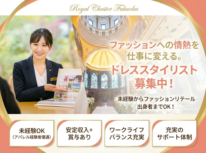 仕事内容 ⭐「運命の一着」を一緒に見つける仕事 花嫁さまがドレスを試着した瞬間、 鏡の前でこぼれる涙。 その隣にいるのが、あなたです。 ただ服を選ぶ仕事ではありません。 “人生で一番きれいな日”をつくる仕事です✨ ✨仕事内容 結婚式場「ロイヤルチェスター福岡」でのドレススタイリスト業務⏩ ✅ ウェディングドレス・タキシード・和装のご提案 ✅ お客様の好みに合わせたコーディネート ✅ 親族衣装の手配・準備 ✅ フィッティング対応 ✅ 式当日のサポート・プランナーとの連携 アパレルとは違い、 “特別な一日”のための提案です⭐ ⭐この求人の強み ✅ 未経験歓迎・研修充実 → 先輩がマンツーマンでサポート ✅ 月給21万円以上+賞与年2回 → 安定収入で将来も安心 ✅ 有給取得率80%以上 → 休みも取りやすい環境 ✅ 借上社宅制度あり → 遠方からの応募も歓迎