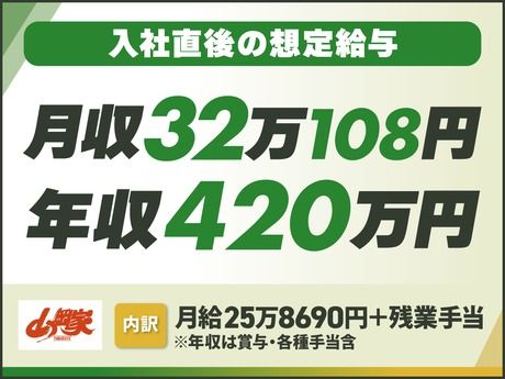 仕事内容 【30~40代から未経験で入社した社員も多数】 SNSやメディアで日々話題になる山岡家のラーメン。 ― でも、選ばれているのはラーメンだけではありません! 実は「働く場所」としても多くの人に支持され、 30~40代から未経験で入社した男性社員も多数活躍中! ====================== 成長加速&エリア拡大中に伴い、 正社員を“積極採用中”!(2024年実績:180名以上) \ 四国初進出! / 4月3日、香川県に「高松中央インター店」がオープン予定! \ 博多区にも出店 / 4月22日、九州福岡に「福岡月隈店」がオープン予定! 福岡市内2店舗目、博多区初出店です!! 【スムーズに業務を始めていただくために…】 入社後は、茨城県つくば市にある自社の トレーニングセンターで研修を実施(3泊4日) ※研修中の交通費・宿泊費は全額会社負担! ※研修中もしっかり給与支給で安心スタート ====================== ◆山岡家の「週休3日制の正社員」は、 自分のペースで飲食スキルが身につく新しい働き方!  ̄ ̄ ̄ ̄ ̄ ̄ ̄ ̄ ̄ ̄ ̄ ̄ ̄ ̄ ̄ ̄ ̄ ̄ ̄ ̄ ̄ ̄ ̄ ̄ 2022年に働き方改革の一環として 「週休3日制の正社員」制度を導入した山岡家。 転居を伴う転勤がないので、 地元でワークライフバランスを実現しながら “無理なく・長く・着実に”キャリアを築けます! \オススメPOINT/============ 【1】週休3日 × 年間休日156日 家族との時間も自分時間も、圧倒的に増える! 【2】夜勤専従で高収入(年収420万円可) 日勤/夜勤の交替なし! 夜勤専属だからこそ「週4日勤務」で高収入◎ 【3】転勤なし!地元で安定勤務OK 住み慣れた場所で、長く働きたい方にも◎! ====================== 【お仕事について】 まずはホ-ル業務からスタ-トし、 店舗全体の流れや雰囲気をつかみます。 その後、キッチン業務や洗い物、 仕込みなども担当していただきます。 <将来的には…> 接客・調理だけでなく、 衛生管理・設備管理など、店長不在の 時間帯の店舗運営も含めてお任せ! \\ 未経験者も段階的に学べます! // ◆冊子のマニュアルや、店舗のタブレットでも 視聴できる動画教材などをご用意。 何を・どの順番で覚えればいいかが明確で安心! ◆全店舗、食券制&設備が整った店内。 丁寧な接客と、ス-プ・ネギ・チャ-シュ- すべてを「お店で手作り」にこだわる山岡家の スタイルに集中しやすい環境です! ※接客・マニュアル・動画はすべて日本語です。 ※また、衛生記録なども日本語で記入します。 【30~40代で入社した男性活躍中】 - 家庭を持った方にも選ばれています - <スタッフの声>※入社3年目・30代・中途社員 プライベ-ト重視の働き方に惹かれて入社。 みなし残業なしで、残業代は1分単位。 家庭と両立できる範囲での異動など、 家族持ちにも優しく働ける会社だと感じています。 飲食業は初めてでしたが、研修やマニュアルで しっかり学べるので、スム-ズに習得できました! 【福利厚生のポイント】 ■残業代は1分単位で全額支給(みなし残業なし) ■昇給・賞与は年2回!! ■プライベ-トの都合に考慮したシフト希望休、 有給の取得も可能!(土日・連休の取得もOK) ■男性社員の育休取得実績もあり! 【昇給制度について】 年2回の定期昇給の他、 社員教育用のオリジナル冊子(教科書)に沿って スキルを習得するたび、基本給UP! 例えば… ・入社~半年:基本給5000円UP(教科書1冊目完了) ・社内試験(実技・筆記):基本給8000円UP …など、頑張りに応じてベ-ス給UPが可能◎!! 【丸千代山岡家について】 全国に190店舗以上のラーメン店を運営中。 売上好調!前年比平均10%以上の成長率! 47都道府県への出店を目指し、新店OPENも続々。 セントラルキッチンを設けず 全店直営&店内手作りにこだわる姿勢で、 根強いファンもたくさんいます! リピート率はなんと75%超え!(自社調べ) <売上高> 186億7600万円(2023年1月期) 264億9400万円(2024年1月期) 345億8500万円(2025年1月期)*前年比130.5%! 《HP》https://www.yamaokaya.com/ 《採用HP》https://recruit.yamaokaya.com/