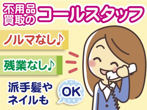 仕事内容 \販売行為なし・対面接客なし・ノルマなし/ 駅チカ、快適リサイクルショップオフィスでの 電話案内のお仕事です。 〇1日4時間・5時間~の短時間勤務 〇土日休みの週休2日(勤務は週3日~OK) 〇扶養内勤務OK、残業ナシ 〇服装自由・髪型髪色自由・ネイルOK・ヒゲOK 〇浅草橋駅から徒歩3分の駅近オフィス 〇未経験歓迎!年齢不問 〇インセンティブ歩合もあり時給2,000円可 【今回の募集職種】 コールスタッフ(パート/アルバイト) <お仕事内容> 基本的にマニュアルを読むだけの案内業務です。 ・リストに沿って電話をかける ・マニュアルに沿って不用品の買取をご案内 ・買取希望の場合日時を予約 手順はたったこれだけ! 「ご自宅に不要なものはありませんか?」 と決まった台詞が言えればOKです! 【服装自由、派手髪OK、ネイルOK、ヒゲOK、ピアスOK】 対面での営業や接客が一切ないコールスタッフだから、 服装や髪型などは自由です。 金髪・ジャージ・どんな格好で出勤してもOK。 【年齢不問!中高年も活躍中】 Wワークと両立しているフリーターの方、 子育て世代の主婦(夫)パート層、 中高年世代まで幅広い年代のスタッフが在籍中! 60歳以上(60代・70代)のシニアも活躍中。 もちろん、電話応対などの受付業務や コールセンター、テレフォンアポインター、 接客などの経験は即活かせるお仕事です。 【週3日~、1日5h~・午前メインの4h~シフトOK】 スキマ時間を活かせる短時間バイト。 仕事と家庭の両立がしやすい環境です。 プライベートを優先したシフトでOK! 【こまめな休憩でリフレッシュOK】 電話によるお客様対応で座りっぱなしになるので、 1時間ごとに10分のプチ休憩(有給休憩)が設定されています。 履歴書不要で、手ぶらで気軽に面接OK! 即日採用も可能ですので、気になったらぜひご応募ください。