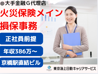 仕事の内容 \大手銀行系列の代理店!正社員に/ ◆増員2名募集!充実した福利厚生 ◆経験浅&ブランクOK!細やかなフォローあり ◆登用後は<在宅ワーク>併用も 【基本情報】 雇用形態:派遣社員 雇用期間:長期(3カ月以上) └26年1月~開始日相談可能 就業時間:9:00~17:00(休憩60分) └登用後は9:00~17:20 【必須条件】 ◆損保代理店もしくは損保会社でのご勤務経験 ◆損保募集人資格:有効な方、無効などの場合は取得いただける方 ◆パソコン:基本操作(入力修正~計算式) ※SJネット使用できる方、歓迎 【お仕事内容】 ・更改/異動手続き(メール・郵送・電話) ・見積り作成 ・計上 ・照会応答 など ※種目:火災保険メイン 自動車保険 ※取扱保険会社:損保ジャパンほか @京橋駅直結! ・東京駅、宝町駅も駅歩5分以内 ・ショップやレストラン多数!おしゃれな高層ビル内 ◆ワークライフバランス重視で働けます◎ ・休暇取りやすい! ・登用後は<在宅ワーク>併用も(条件あり) 【環境面等】 ・女性が多くご活躍中!上長も女性で細やかなフォローあり!TCS派遣スタッフさんご活躍中 ・静かで落ち着いた雰囲気 ・ランチタイムは休憩スペース利用OK └お弁当持参OKです ・オフィスカジュアル内で服装自由 【福利厚生等】 ・社会保険完備 ・禁煙オフィス!煙苦手な方も安心 ・平日のみOK!土日祝休み ・年間休日120日以上&お休み相談可 └有給休暇、年末年始休暇など ~家庭やプライベートとの両立も◎安定した環境で、無理なくお仕事したい方にぴったりの職場です!ご応募お待ちしています!~ ○●嬉しいPOINTたくさん!●○ 正社員前提/紹介予定派遣/転勤なし/U・Iターン歓迎/賞与年2回あり/昇給年1回あり/福利厚生充実/退職金あり/開始日相談/駅直結/駅チカ/駅歩5分以内/損保ブランクOK!社員に相談できる/月収例25万円以上/社会保険完備/派遣期間中は残業なし!毎日17時退社/交通費全額支給/残業代全額支給