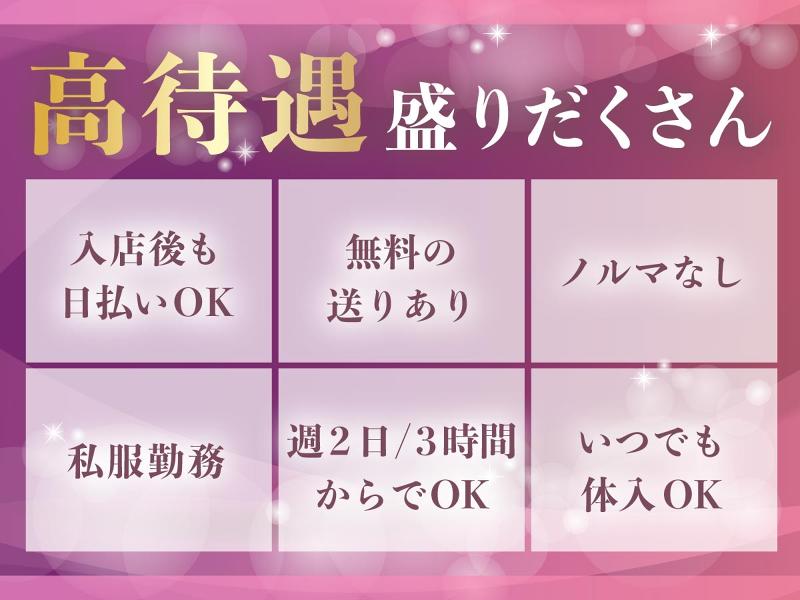 アピールポイント: 「やってみたい、でもまだ不安」 ⇒だったらお試し勤務☆ いきなり長期で働き始めるんじゃなく まずは試してみて、「意外と簡単」と 自信を持てたら長期に切り替えOK! ー・ー・ー・ー・ー・ー・ー・○・* 「やってみたい、でも終電が」 ⇒だったら終電まででもOK☆ 終電がなくなっても送迎があるので しっかり稼ぎたい方にもオススメ♪ 帰り道の心配はしなくて大丈夫! ー・ー・ー・ー・ー・ー・ー・○・* アナタの「でも」も、スパッと解決☆ 「やってみたい」の気持ちを優先して 今の生活を変えちゃいましょう♪