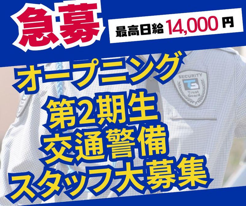 職場環境 2024年6月に立ち上げました!「トラストガード!」 オープニング第2期生の交通警備隊員大募集! 新規現場が続々スタート!アナタの希望のエリアをご紹介します! 喫煙所:喫煙所あり(屋外)