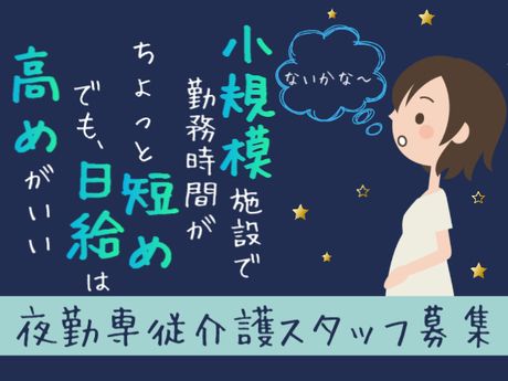 【実働14.5時間夜勤】比較的小規模な施設♪日給2万7025円/週2回~相談OK/2名体制/車通勤可