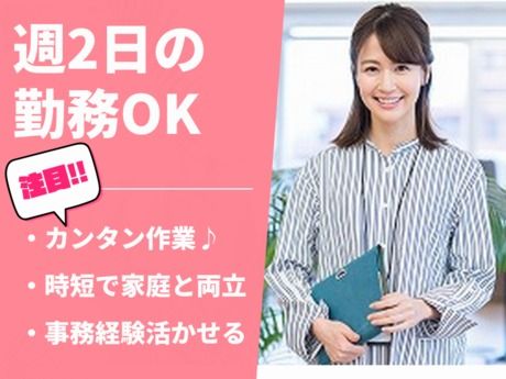 仕事内容 \ここがポイント/ ★週2日×時短勤務で家庭と両立◎ ★ブランク明けの仕事復帰にもピッタリ♪ ★PCスキルを活かして働ける環境◎ *・。・。*・。・。*・。・。* <仕事内容> \営業さんを支えるサポート事務のお仕事♪/ ・見積書の作成や出荷データの処理 ・受注データや在庫管理の入力作業 ・お客様対応や資料送付などの事務業務 ・名刺や取引履歴のデータ入力作業 ・自社ホームページの更新作業 (簡単な修正がメインで安心です◎) 事務経験を活かして、落ち着いた職場で チームの一員として活躍してみませんか? 週2日・短時間で無理なく働けるので、 子育て中の方やブランク明けの方にも最適! 業務内容は就業後に変更なしで安心♪ 安定して長く働ける環境が整っています。 *・。・。*・。・。*・。・。*