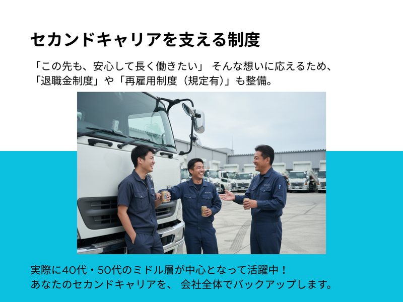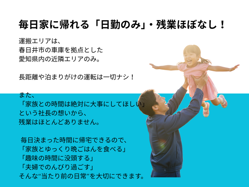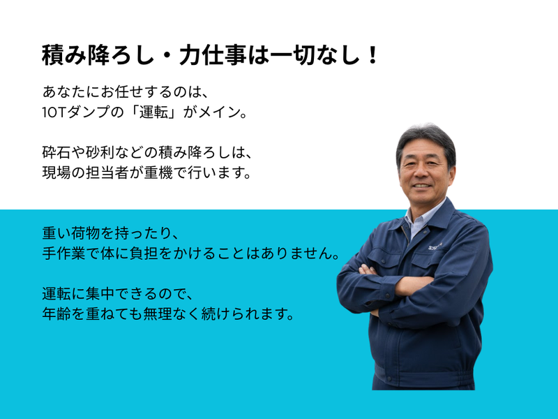 仕事内容 \2026年3月・新体制に向けて増員募集!/ 「同じダンプに乗るなら、 10年後も笑っていられる場所を選びませんか?」 求人をご覧いただきありがとうございます! 立志建設です。 おかげさまで業績は安定、 今回はさらなる現場増加に伴う 増員募集 です。 「体力的に、今の働き方を続けるのは不安…」 「日給制だと、雨が降るたびに通帳を見てため息が出る…」 そんなベテランの皆様、お待たせしました。 当社は、社長(森下)の 「社員の家族との時間を守りたい」という強い想いから、 ✔ 月給32万円〜の完全固定給 ✔ 徹底した残業削減 を実現しています。 \迷ったら、まずはお電話ください!/ 052-737-2313 (担当/総務課) 「求人を見た」とお伝えいただければスムーズです! ⭐59歳以下・大型免許をお持ちの方は全員面接します。 ⭐「まずは話だけ」という職場見学も大歓迎! *‥‥*‥‥*‥‥*‥‥*‥‥*‥‥* ⭐基本土日祝休み(会社カレンダーで土曜出勤あり) ⭐毎日家に帰れる!日勤のみ&地場運搬 ⭐月給32万円~の安定収入×天候に左右されない! ⭐残業ほぼなし!毎日夕方には自分の時間◎ ⭐有給取得率ほぼ100%!子どもの行事も安心♪ ⭐資格取得も応援!スキルアップ可能 ⭐遠方の方も安心!格安の個室寮あり(月3万円・光熱費込) *‥‥*‥‥*‥‥*‥‥*‥‥*‥‥* 「50代に入り、“これからの働き方”を見直したい」 「日給制だと、雨が続いた月の給与が本当に心配だ…」 「まだまだ現役。でも、無理はしたくない」 そんな長年の経験を持つベテランドライバーのあなたへ。 その悩み、立志建設で「安心」に変えませんか? 当社では、ドライバー経験者の多くが 「ここを最後の職場にしたい!」と言ってくれます。 その理由は、 【月給32万円~の安定】と【体に無理のない働きやすさ】の両立。 あなたの経験を、当社で存分に活かしてください!✨ *‥‥*‥‥*‥‥*‥‥*‥‥*‥‥* ■経験者が「ココだ!」と決める、 立志建設の魅力 ┈┈┈┈┈┈┈┈┈┈┈┈┈┈┈┈•• ✅ 【最大の安心】 天候に左右されない「月給32万円~」 「雨が続くと仕事が減って、収入が不安定になる…」 日給制ドライバーの、そんな切実な不安。 実は、以前は当社も日給制でした。 しかし「家計が苦しい」という社員の声を聞いた社長が、 思い切って【月給32万円~】の固定給に変更! 「雨で仕事がなくて収入が減る…」 なんて心配は、もうありません。 (※たまに軽作業をお願いする場合もありますが、 給与は安定支給です!) ✅【身体がラク】 毎日家に帰れる「日勤のみ」 運搬エリアは、 春日井市の車庫を拠点とした愛知県内の近隣エリアのみ。 長距離や泊まりがけの運転は一切ナシ! 毎日しっかり家に帰って、自分の時間を過ごせます。 ✅【体力負担ゼロ】 積み降ろし・力仕事 基本なし あなたにお任せするのは、 10tダンプの「運転」がメイン。 砕石や砂利などの積み降ろしは、 現場の担当者が重機で行います。 重い荷物を持ったり、 手作業で体に負担をかけることはありません。 運転に集中できるので、 年齢を重ねても無理なく続けられます。 ✅【毎日が快適】 残業ほぼなし!17時には「お疲れ様」 「家族との時間は絶対に大事にしてほしい」 という社長の想いから、 残業はほとんどありません。 (※朝は早めですが、その分夕方にはきっちり終了!) 毎日決まった時間に帰宅できるので、 「家族とゆっくり晩ごはんを食べる」 「趣味の時間に没頭する」 「夫婦でのんびり過ごす」 そんな“当たり前の日常”を大切にできます。 仕事が早く終われば、 15時台に退社できる日も(もちろん給与は全額支給)! ✅ 【遠方からの転職応援】 格安の個室寮を完備! 「今の家からは少し遠いけれど、立志建設で働きたい」 「生活費を抑えて、しっかり貯金や仕送りをしたい」 そんな方を応援するため、 拠点近くに "月3万円(水道光熱費込)" で利用できる寮をご用意しました! 完全個室でプライベートも確保できます。 ※詳細については、面接時に丁寧にご説明します。 ✅【長く働ける】 これから10年を安心して働ける制度 「この先も、安心して長く働きたい」 そんな想いに応えるため、 「退職金制度」や「再雇用制度(規定有)」も整備。 実際に40代・50代のミドル層が中心となって活躍中! あなたのセカンドキャリアを、 会社全体でバックアップします。 ✅【休みも充実】 有給取得率100%&大型連休 「休みたいけど、言い出しにくい…」 そんな雰囲気は一切ナシ! 有給取得率は、なんとほぼ100%! 通院や、家族サービス、趣味の旅行など、 気兼ねなく取得できます◎ さらに、GW・夏季・年末年始は【各9連休】(実績あり)! 大型連休でしっかり体をリフレッシュできるのも、 長く働ける秘訣です✨ ■実際のお仕事内容 ┈┈┈┈┈┈┈┈┈┈┈┈┈┈┈┈•• 10tの大型ダンプを運転して、 砕石や砂利などの建設資材を 指定の現場までお届けするお仕事です! ✅ 運搬エリア 春日井市の車庫を拠点に、 愛知県内の近隣エリアのみ。 長距離や泊まりがけの運転は一切ナ