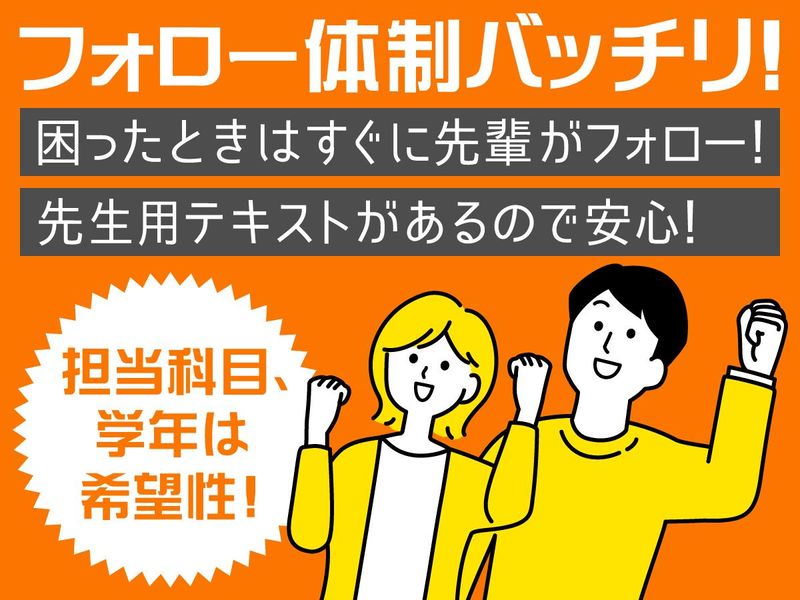 仕事内容 \⭐ 採用お祝い金1万円 ⭐/ 1勤務80分・週3日! 休み希望は”99%”叶えます! もちろんガッツリ勤務も歓迎♪ 【 塾講師って…難しそう? 】 ▼ 実は ▼ 【安心◎】✅先生用テキスト有 【希望制】✅得意な科目でOK! 【選択可】✅小・中・高校生から選べる 【1対1】✅コミュニケーション◎ だから、未経験からでも 問題なくスタートさせられますよ♪ \ 生徒さんの成長が嬉しい♬ / ⋱⋰⋱⋰⋱⋰⋱⋰⋱⋰⋱⋰⋱⋰⋱⋰⋱ 個別指導塾の講師のお仕事です。 1コマ80分!個別指導システムの特徴! ◆前半:演習指導(40分)◆ ・子供たちが演習に取り組むので 傾向や特徴を掴める ◆後半:完全1:1指導(40分)◆ ・演習問題の状況を踏まえ個別指導! ・個人の課題にしっかり向き合う! ひとりひとりのつまずきの瞬間に立ち会える ⋱⋰⋱⋰⋱⋰⋱⋰⋱⋰⋱⋰⋱⋰⋱⋰⋱ \ 教育学科の学生さん活躍中♬ / 先生を目指す第一歩として 多数の学生さんにも選ばれています♪ ✨生徒さんの成長を喜べる✨ 教育現場の経験は、 今後、きっと役に立つはずです! ⋱⋰⋱⋰⋱⋰⋱⋰⋱⋰⋱⋰⋱⋰⋱⋰⋱ ✋スタッフの声をご紹介(,,ᴗ ᴗ,,) ◆困った時でもすぐフォローしてくれる ◆得意科目だけ教える事ができる ◆コミュニケーション力に自信がついた ◆就活時の面接でとても役立った ◆自分の子にも要領よく勉強を教えられた ⋱⋰⋱⋰⋱⋰⋱⋰⋱⋰⋱⋰⋱⋰⋱⋰⋱