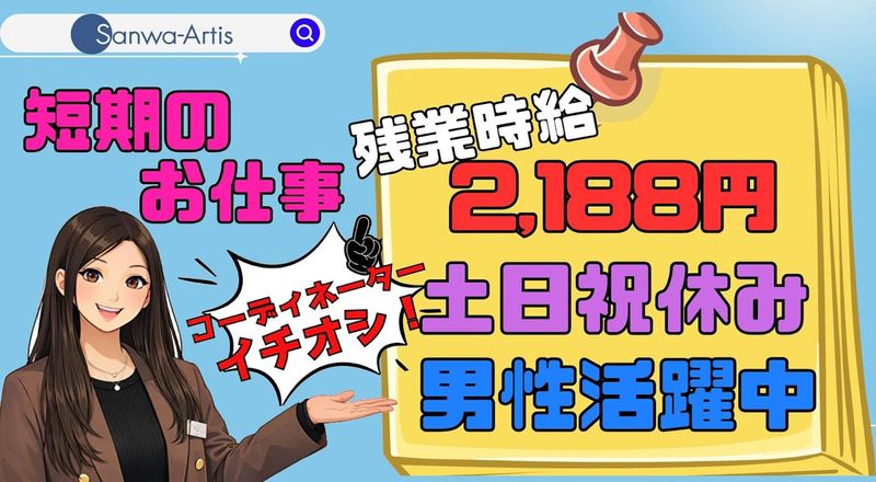 仕事内容 \\ 2ヵ月未満の短期お仕事 // \\ 超高時給1,750円 // ー ** お仕事内容 ** ー 倉庫内での出庫作業をお願いします(*'ω'*) 【具体的には】 ■出荷する製品を探して運ぶ ■製品のチェック ■ラップをくるくる~と出荷準備 などをお願いしています( `ー´)ノ 重量物もありますが、 2人以上での作業だから安心◎ ハンドリフトも使用します☆ ー ** 事前の職場見学 ** ー オンライン登録、随時受付中です!! お家にいながら、チャチャッと スキマ時間で登録ができちゃう(^^ 実際にどんなところか見てみないと 分からない... そんな方は私たちと一緒に職場見学に いきませんか?(`・ω・´) 働く前に見学ができるので 安心ですよねっ☆彡 お気軽にご連絡ください☆ 皆様にお会いできることを 楽しみにしております! サンワアルティス株式会社 スタッフ一同より(^^)/ 2260900