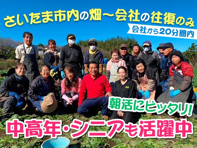 仕事内容 未経験者歓迎!普通免許(AT限定可)あればOK! 畑から会社への往復!さいたま市内のみ! <注目ポイント> 〇16時終了(多少変動あり) 〇週3日~OK 〇長距離なし 〇中高年・シニア活躍中 〇WワークOK 現在は夏季時間でのお仕事になります 早起きが得意な方・朝活したい方にピッタリ! 【仕事内容】 さいたま市岩槻区・見沼区にある畑で採れた 小松菜を運搬・搬入するお仕事です。(会社から20分圏内) 小松菜が入ったケース(10kgほど)を トラックの荷台へ積み込み、会社の冷蔵庫へ搬入します。 人手が少ない日は収穫のお手伝いもお願いします。 ケースは10kgほどの重さがあるため体力に自信のある方、 また畑での運転になるので運転に自信のある方を求めています! トラックはバックモニター付きです <こんな方にオススメ> 〇農業アルバイト・パート経験者 〇配送ドライバーアルバイト・パート経験者 〇経験・年齢不問の仕事を探している 〇扶養範囲内で働きたい 〇定年退職後のお仕事に 【勤務について】 7:30~16:00、週3日~OK 時間・曜日はご相談ください! ▼1日のスケジュール例(夏季時間) 7:30 出社、収穫の準備 8:00 畑に移動 ~12:00 小松菜の収穫、トラックに積み込み ~16:00 会社に戻り、冷蔵庫へ搬入 ※収穫~搬入を数回往復していただきます ※会社から片道20分圏内に畑はあります 朝早い分、16時には終了! 週3日から働けるのでプライベートも充実 日曜日はお休みです! 現在、中高年・主婦パートさん合わせて40名活躍中 収穫は外での作業になりますので、 休憩・水分補給をこまめに挟んだりスタッフ同士協力しています。 シニア・年金受給者も活躍中! 私たちと一緒に自然の中でのひのびと働きませんか! ▼最新情報はこちらよりご覧ください [採用情報]https://entori.jp/wakata [HP]http://www.ecofarm-wakaya.co.jp まずはお気軽にお問い合わせください。 TEL.048-878-1048