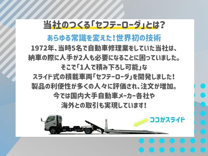 仕事内容 \\この求人のアピールポイント// ==================== ✨企画力・発想力を活かせる! オーダーメイド設計に挑戦できる! ✨第二新卒・未経験でもCADや設計に 興味がある方歓迎! ✨転勤なし! 腰を据えてキャリアを築ける! ✨風通しの良いフラットな職場環境! ✨60年の歴史を持つ安定企業で働ける! ==================== ✅募集要項 ──────────────────── 【給与】 ・月給18万4500円~27万4500円 【勤務時間】 ・8:00~17:00 【休日】 ・週休2日制(会社カレンダーによる) ※月2回の土曜日出勤あり 【試用期間】 ・6ヶ月(本採用と条件同じ) 【福利厚生】 ・社会保険完備 ・賞与あり ・交通費全額支給 ・退職金あり など 別途会社独自の福利厚生制度あり。 ・1時間単位で有給取得可能! 「今日は16時で上がって病院に行きたい」 「子供の用事を済ませてから出社したい」 とプライベートを優先することができます。 クリスマスイブには毎年会社から クリスマスケーキもプレゼントしています。 《お仕事内容 》 ・・・・・・・・・・・・・・・・・・・・・・・・・・・・・・・・・・*・・・・ CAD(マイクロキャダム、ソリッドワークス) を使ったオーダーメイドでの荷台設計を お任せいたします。 お客様の期待を超える機能と形を 実現するために、企画力・発想力を存分に 活かし進めてください! ⭐職場の環境⭐  ̄ ̄V ̄ ̄ ̄ ̄ ̄ ̄ ̄ ̄ ̄ ̄ ̄ ̄ ̄ ̄ ̄ ̄ ̄ 職場の雰囲気は自由度と責任のバランスが 取れています! 上司部下の垣根なく話せるフラットさが あります♪ 経験者の方はもちろん、 未経験でもCAD、設計、ものづくりに 興味がある方も歓迎しています! 安心して知識やスキルを習得し、 成長できる環境です!! <当社について> ー 設立より60年の歴史ある企業で、 TOYOTA・日産等の大手自動車メーカー様 からJAXAといった有名企業を主要取引先と しており、経営・売上ともに 安定しております。 昭和47年、当社は世界で初めて トラックの荷台そのものを スライドさせて、スロープのように 傾斜できる車両(セフテーローダ)を 開発し、積載が難しかった車両・機械 などの搬送における省力化と安全性を 実現しました。 開発当初よりスライドボディの生産実績は 揺るがず、業界を牽引し続けています。 合言葉は「やってみようぜ!」 新しいことにも前向きに挑戦を歓迎する 社風が自慢です✨ ★経済産業省「地域未来牽引企業」認定