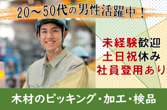 仕事内容 人気の土日祝休みの職場です!長期休暇もあるのでプライベート充実派におすすめ◎体を動かすのが好きな方・木材加工経験者・もちろん未経験者も大歓迎!! <仕事内容> 木材加工業務になります。 木材のピッキング→木材加工業務(オペレーター)→検品 この一連業務を行っていただきます。 また、木材のピッキング時は5~6メートルほどの長さの木材を扱う事もあるので重量物を扱うこともあります。 ライン作業でのお仕事です。 立ち作業となります。 重量物を扱う(15㎏以上)可能性がございます。 個人作業・グループ作業どちらもございます。 《職場環境》 男性が多い職場です。 外国籍の方が活躍中です。 ロッカー有り|休憩室完備 アピールポイント <仕事内容> 木材加工業務になります。 木材のピッキング→木材加工業務(オペレーター)→検品 この一連業務を行っていただきます。 また、木材のピッキング時は5~6メートルほどの長さの木材を扱う事もあるので重量物を扱うこともあります。 ライン作業でのお仕事です。 立ち作業となります。 重量物を扱う(15㎏以上)可能性がございます。 個人作業・グループ作業どちらもございます。 《職場環境》 男性が多い職場です。 外国籍の方が活躍中です。 ロッカー有り|休憩室完備 \充実した福利厚生/ ◎社会保険・雇用保険完備 ◎有給休暇有(6ヶ月経過後、10日付与)※規定あり ◎残業手当 ◎交通費支給(規定内) ◎確定拠出年金制度 ◎週払い制度(週3回対応) ◎お友達推薦制度あり(規定有り) ※1名につき3万円~10万円臨時給与として支給 ◎車(マイカー)・バイク通勤OK(駐車場無料!) ◎制服貸与 ◎ロッカー・休憩室利用可 ◎福利厚生プログラム (宿泊、グルメ、ショッピングなど大幅割引が受けられる10万アイテムのメニューがあります。)