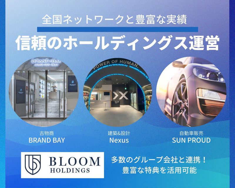 求めている人材 ✓未経験OK! ✓不動産業界経験不問 ✓正社員としての不動産営業経験者や不動産エージェント経験者どちらも大歓迎! ================== ~こんな方にもピッタリの職場です!~ 以下に当てはまる方は、この機会にぜひ 環境を変えるチャンスかもしれません! ================== ■営業経験を活かして不動産業界に チャレンジしたいと考えている方 ■出社義務や時間に非効率さを感じている方 ■経験を活かして自由度高く稼ぎたい方 ■コネや人脈を活かしきれていない方 ■趣味や家族との時間と両立して働きたい方 ■本業の収入にプラスして少しでも年収を上げたい方 ✅当社エージェントとしてのステップアップ・キャリア形成について! ご契約後のサポート体制が充実! 不動産業界未経験の方には、業界知識や営業手法に関する研修も行います。 不動産業界経験者に対しても、 未経験分野の知見を深める フォローアップ研修制度もあるので、 今まで以上に知識や武器を増やすことができ、可能性を広げていくことが可能です。 また、当社が所属している“ブルームホールディングス”内には様々なお仕事があります。 やる気次第ではグループ内での兼業・副業も可能。グループ企業での社員雇用のチャンスもあります。 当社では、不動産営業の枠にとらわれず、様々なことにチャレンジしたい方も全力応援します!