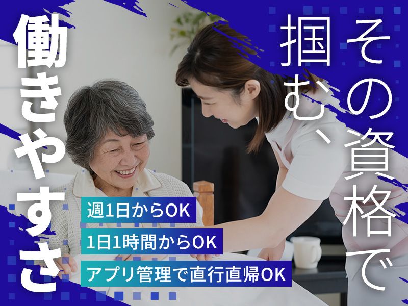 仕事内容 <週1日・1日1時間からOK> 実務経験は不問です! 資格を活かして隙間時間バイト! 柔軟な働き方が可能な 直行直帰OKの訪問介護です。 ▽この求人のPoint ・週1日~OK ・1日1時間~OK ・直行直帰OK ▽具体的な業務内容 利用者様のご自宅や 施設を訪問しての、 介護業務をお任せします。 ・身体介助(入浴・排泄等) ・生活援助(掃除・洗濯等) ・移動支援 など ▽業務の補足 ご自身のスマホアプリで 報告完了できます。 事務所に寄る必要がなく、 時間を有効に使えます。