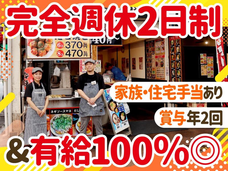 仕事内容 ✅未経験から最速3年で店長も可! ✅完全週休2日制&有給100% ✅賞与年2回◎住宅手当・家族手当あり 『チームワークを大切に』 スタッフが無理なく長く働きながら 成長していける環境づくりを実践中! その働き方とは?▶3ポイントでご紹介! ==================== ✅①チームで成長を助け、キャリアアップ ==================== 評価制度でも「仕事が早い人=偉い」ではなく 「仕事の遅い人のこともフォローできる人」 を評価しています。 一人の力量に頼る職場ではなく、 会社がチームとして社員をサポートし 成長をしていくことで、 1人1人の仕事の質も高まる。 そんなチームで成長できる環境だから 飲食未経験からの役職者が多数! 現在のマネージャーも実はその一人! 最速3年で店長を目指せるなど、 スタート関係なく、やる気や頑張りが しっかり評価されていきます◎ =================== ✅②仕事と休みのメリハリをしっかりと =================== 「完全週休2日制」「有給取得率100%」 の働き方も実現しております! また、弊社では ≪ワーク重視型≫≪ライフ重視型≫ 2種類の働き方をご提案しており、 今回推奨している ≪ワーク重視型≫の働き方について ・早く出世したい・会社を大きくしたい ・独立したい・役職を上げたい・稼ぎたい という思いのある方は 残業をしたり、出勤日数を増やしたり した働き方が可能です。 逆に≪ライフ重視型≫の ライフワークバランスを大切にした 給与は下がるものの「残業なし」。 そんな働き方も可能です◎ 最初は≪ライフ重視型≫ 後から≪ワーク重視型≫のような 働き方も可能なのでお気軽にご相談ください! ================== ✅③社員の安定は給与面でもサポート ================== 「賞与年2回」に加え、 「住宅手当」「家族手当」「退職金制度」 もあり、社員の生活の安定もサポート。 また、売上のノルマはありませんが 頑張った売上に対しての「歩合給」や キャリアアップで役職に応じた 「職能手当」も準備。 会社の成長には、社員の活躍が必須なので 社員が働きやすい環境を整えながら よりよい職場づくりを引き続き行っていきます。 ▶こんな弊社の働き方に共感できる方は ぜひ一緒に働きましょう! =========== 【具体的なお仕事は?】 =========== たこ焼き・うどん屋での ホール・調理補助業務をお任せ! マネージャーや先輩社員の 丁寧な指導があるので未経験も安心◎ ≪ホール≫ ・お客様のご案内 ・注文対応 ・料理の提供 ・片付け など ≪調理≫ まずは簡単な作業からおまかせ◎ ・うどんをつくる ・たこ焼きを焼く ・盛り付け ・皿洗い など その他 開店・閉店時の店内清掃など 店舗運営の業務に関わっていただきます。