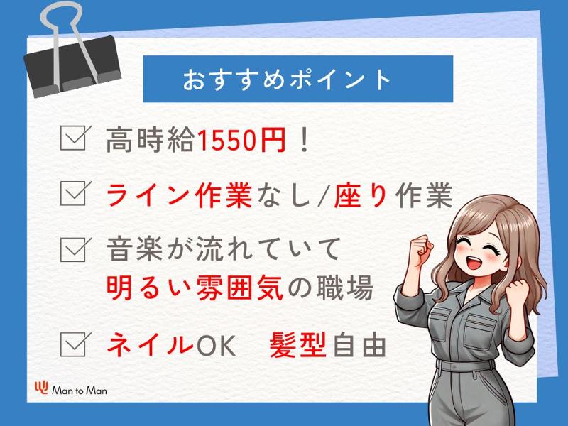 仕事内容: 【職種】 手のひらサイズの電子部品の座り検査 【仕事内容】 自動車に使われる電子部品や鋼材を作る、大手自動車メーカーの系列会社でのお仕事です! 女性が活躍中の、座り作業での検査仕事の職場です。 【このお仕事のポイント】 ・力仕事は一切なし!! 扱う製品が手のひらサイズまでと小柄なので、体への負担が少ないです。 ・座り作業がメイン 基本、座りながら目視で検査するお仕事です。 ※検査する部品を持っていく時などに、一瞬モノを持ち上げたり、運搬することもあります。「座りっぱなしで逆にツライ…」ということはありません! ・髪色とネイル自由 お仕事だからと髪やネイルを諦めなくても大丈夫です。 実際に弊社のスタッフのほとんどが、髪色とネイルを自由に楽しんでいます! 【お仕事の内容】 自動車に使われる電子部品の検査スタッフの仕事です。 ・具体的なお仕事 主には、製品に傷や汚れがないかチェックするだけの簡単な作業! 他にも完成品の袋詰めなどもお願いします。 すべて簡単な軽作業です! ※製品サイズは粒ガムサイズ〜名刺サイズと小さめです。 未経験の方でも、最初は先輩スタッフがついてダブルチェックを行うので安心です。 自分専用の作業台で作業するので、誰とも話さず黙々と作業したい方にとてもおすすめ! 【どんな職場?】 ・冷暖房バッチリ! 空調完備の快適職場です。 ・音楽が流れていて、明るい雰囲気の職場です。 ・女性活躍中の職場です 20代前半~30代の女性が多い職場です! ・日勤/夜勤の交替勤務 ・土曜面接開催中! 正社員登用も積極的に行っているので、将来正社員として働きたい方も大歓迎です! 少しでも気になった方は、ぜひお気軽にご応募ください。