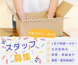 仕事内容 <アピールポイント> 主婦・主夫の皆様が安心して働ける環境をご提供します。 1.柔軟な勤務時間 子供の学校行事や家庭の事情に合わせてシフトを調整可能。4-5時間程度の短時間勤務もOK 2.ワークライフバランス重視 日中のお時間を活用できるので、家庭との両立が可能です。 3.家庭と両立しやすい環境 急な家庭の事情にも柔軟に対応。お子様の病気や学校行事に合わせてシフト調整OK 4.サポート体制の充実 未経験でも安心!イチから丁寧に教えてもらえる環境で、ブランクがあっても安心して働けます 5.職場の雰囲気 困ったことや不安なことがあれば、気軽に相談できるアットホームな雰囲気です。 6.自由度の高い 安定した収入を得られ、服装や髪型、ピアスなど自由度が高い職場です。 7.仕事内容 モクモクと取り組める作業が多く、家庭のスキルを活かせるお仕事もあります。 「子供がいてもシフトの融通が利くので、働きやすくて助かる!」といった もいただいております。 安心して長く働ける環境が整っています。まずはお気軽にお問い合わせください。 <仕事内容> お仕事にご興味を持っていただきありがとうございます。 弊社は通販事業を運営する会社です。 事業拡大により、軽作業、梱包・発送業務を手伝っていただけるパートさんを募集します♪ 月に3,4日程度の土曜日もしくは日曜日の出勤が可能 + 平日週1日~3日程度で働いていただける方を探しております。 (平日の時給は1200円!土日は時給upの1300円♪) ペット用品や化粧品関連など幅広く取り扱っております。 【主な仕事内容】 * 注文に応じて商品を梱包、発送ラベルの作成貼付け、発送業 * 商品の荷受け、検品作業 * 在庫整理など 特殊な作業はありません! 初めてでも丁寧に指導させていただきますのでご安心ください♪ ※パソコンを使って伝票を打ち出したりする作業がございます。 基本的なpc操作(文字入力、web検索、コピー&ペーストなど) ができれば問題ありません。 エクセルを使った難しい作業などはございませんのでご安心ください。