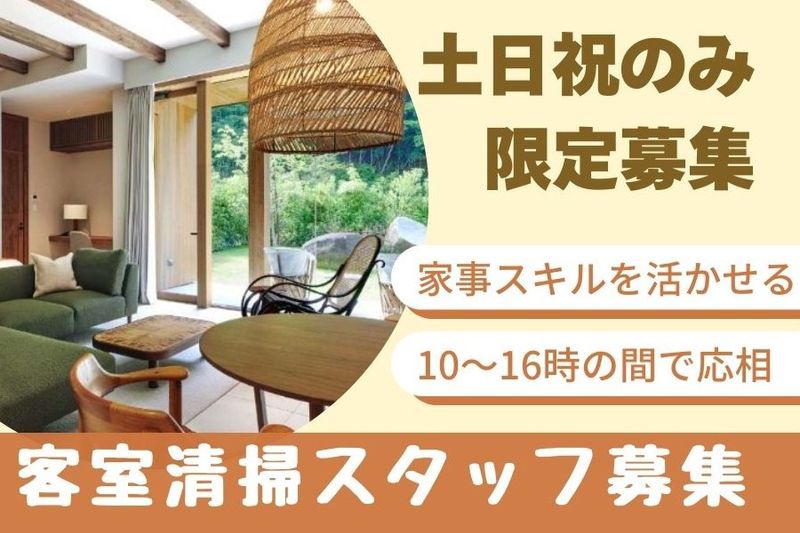 【仕事内容】 世界的に有名なホームファニシングショップがデザイン監修を手がけたホテル「HACIENDA VISON(ハシェンダ ヴィソン)」にて、客室清掃スタッフを募集します。 土日祝のみの限定募集です! 【具体的なお仕事内容】 ・シーツ、ごみの回収 ・掃除機がけ ・お風呂・トイレ・洗面台などの水回り清掃 ・ベッドメイク、紙類など消耗品やアメニティのセット ・テーブル等の拭き上げ作業 全6室の緑に囲まれた小さなリゾートホテルです。 時間に追われて、次々と客室を清掃していくというよりは、ひと部屋ひと部屋をじっくり丁寧に綺麗にして頂きます。 難しい作業はなく、普段の家事の延長で働いていただけます。 【HACIENDA VISONについて】 VISONでも最も緑豊かな農園エリアに建つ、株式会社コンランショップ・ジャパンがデザイン監修したはじめてのホテルです。 ■ザ・コンランショップがデザイン監修 世界的に有名なホームファニシングショップ「ザ・コンランショップ」が監修したデザイン空間で、洗練された美しさと贅沢な時間をお届けしています。 ■洗練されたデザインの客室 総客室はわずか6室。一部屋ごとにコンセプトが異なり、豪華でありながら自然美を感じる温かみのあるインテリアが魅力です。 ■日常を忘れる特別な空間 ホテルの周りには、幻想的な山並みや美しいガーデンが広がります。静寂と自然の美しさが調和する場所ならではの非日常空間です。 ======================= 上質な空間で、おもてなしの心を育む ======================= 当ホテルは、四季折々の美しい自然に囲まれた贅沢な環境で、お客様に心からリラックスできるひとときを提供しています。洗練されたデザインと温かみのある空間で、非日常を感じながら働くことができます。 日々、自然の美しさに触れながら、贅沢な時間を演出する仕事に携わることで、自分自身の心も豊かに成長できる環境です。特別な空間で、あなたらしく働いてみませんか? 【求人ID-SUN】