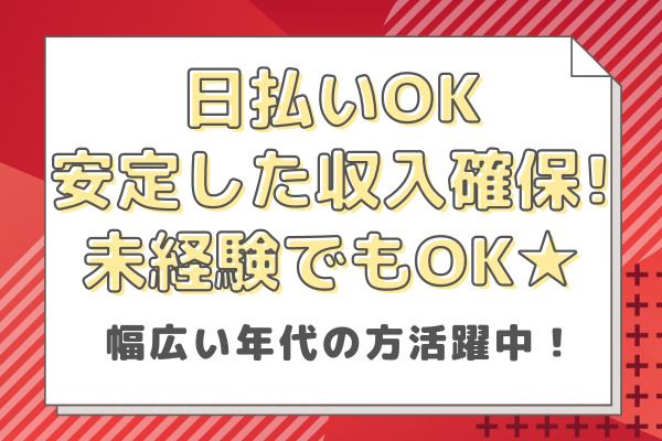 【保険制度】 雇用保険、労災保険、健康保険、厚生年金 待遇 ◆全額日払いOK!(土日祝を除く) ◆昇給有 ◆社会保険完備 ◆交通費規定支給 ◆残業手当有 ◆履歴書不要