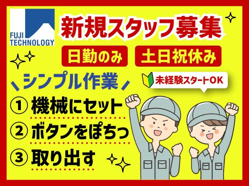 仕事内容 ☆☆< おすすめポイント >☆☆ ✅日勤のみ&土日祝休み ✅シンプルな工程で覚えやすい ✅50代前半までの男女活躍中 << 仕事内容 >> プラスチックの板を機械で 決められた形にくり抜く工程です。 どれも簡単で軽作業なので安心♪ ▼具体的には… 1.専用の機械へ プラスチックの板をセット 2.ボタンを押すと 機械が自動でくり抜く 3.出来上がったものを取り出す ◎上記の工程の繰り返しなので 未経験の方も覚えやすいですよ! ◎扱うものはA4ファイル2枚分ほどの 大きさで軽くて薄いです。 ※立ち作業になります。 【職場見学できます!】 面接後、後日日程調整のうえ、 作業の詳細も現場担当者より詳しく教えてもらえるので 入社後の仕事内容が頭の中でしっかりイメージできます! 分かりづらいことや不安な事はその場で気軽に質問しやすい 雰囲気の見学となりますので安心してください / 富士テクノロジー株式会社です \ 2007年に派遣事業を始め、 三重・岐阜で地域に根差した会社です 地元だからサポートが丁寧で迅速 企業様とも良好な関係性が自慢! 入社するまで、で終わらない 入社してからのサポートが違います お仕事をお探しの方は ぜひお気軽にご相談ください