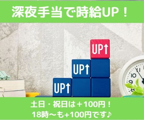 時給1,200円~1,400円 給与 時給1,200円〜1,400円 ――――――――――――――――― 8~18時:時給1,200円~ 18~22時:時給1,300円~ ※研修期間中(150h)時給1,150円 ――――――――――――――――― ・18時以降は時給100円UP! ・土日、年末年始、GW、お盆時は更に時給100円UP! 8時~18時:時給1,200円+100円=時給1,300円 18時~22時:時給1,300円+100円=時給1,400円 ・昇給あり ・前給制度あり ・交通費規定支給 【給与例】 【給与例】 【月収例】 中番、週3日フル勤務の場合 月収11万5200円 頑張った分しっかり収入につながります!