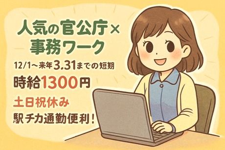 資格 ・安定感のある官公庁関連業務で働きたい方 ・期間を決めて集中して働きたい方 ・事務や電話応対の経験を活かしたい方 ・フルタイムだけでなく、週3~4日勤務など柔軟に働きたい方