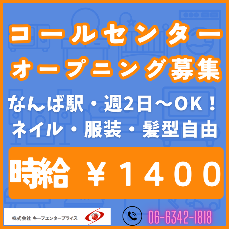 選考プロセス ≪応募後の流れ≫ 【WEBからの応募】24時間受付中! 氏名、メールアドレス、電話番号等を入力して簡単応募。 応募いただきましたら、弊社よりご連絡させていただきます。 【電話でお問合わせ】 TEL:06-6342-1818 『Indeed(インディード)を見ました!』とお伝えください。 受付時間は、下記の通りです。 ≪平日≫9:00-19:00 ≪土・祝日≫9:00-18:00 ▼ <来社不要!WEB面談or電話面談> WEB面談(テレビ電話)を実施しております。 ※電話面談もご相談ください。