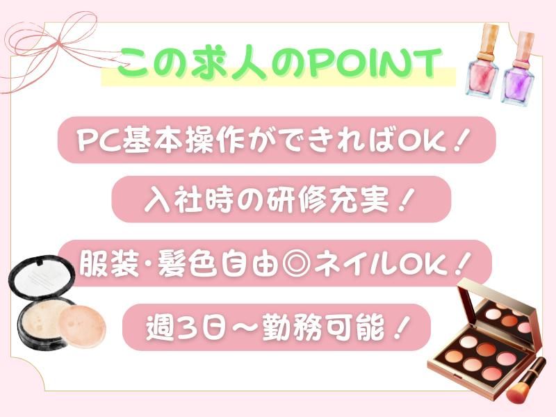 仕事内容 ◇◆◇◆◇◆◇◆◇◆◇◆◇◆◇◆◇◆◇◆ <<年内限定>>スピード採用実施中!! 最短で応募から2営業日で内定も可能!! 就業開始日はお気軽にご相談ください!! ◇◆◇◆◇◆◇◆◇◆◇◆◇◆◇◆◇◆◇◆ 【アピールポイント】 ✅1月13日~3月末までの短期集中! ✅週3日~OK!土日祝休みでプライベート充実! ✅オシャレ自由!自分らしく働ける! ✅設備充実!快適なオフィス環境! 【仕事内容】 \3月末までの期間限定!/ CMでもおなじみの人気ブランドを支えるオフィスワーク! 化粧品メーカーのコールセンターで、お客様からのお電話に対応していただくお仕事です。 「販売ノルマ」は一切なく、ガツガツ売る「営業」ではありません! マニュアル(台本)通りにご案内できればOK! お電話の向こうは、あなたと同じ「コスメが好き」なお客様です◎ <具体的なお仕事> ✨注文受付 「新商品が気になる」というお客様の注文をシステムに入力! ✨登録情報の変更 「お届け日を変更したい」「住所が変わった」などの手続きを行います。 ✨キャンペーンのご案内 お問い合わせいただいたお客様に「今だけ〇%オフですよ」と台本通りに添えるだけ! <安心ポイント> ◎トークスクリプト(台本)完備! 「こう言われたら、こう返す」が決まっているので、未経験でも迷わず対応できます。 ◎返答に困ったら「少々お待ちください」でOK。隣にいる先輩にすぐに助け舟を出せます! ◎入社後はしっかりとした研修からスタート!デビュー後も先輩がサポートするので安心です! ※就業後、仕事内容に変更はありません ///////////////// <電話でのお問い合わせ> *0120-077-170* までお問い合わせください。 ///////////////// ✅1月13日~3月末までの短期集中! ―――――――――――――――― 期間が決まっているので、「次の仕事までのつなぎ」や「春休み期間だけ働きたい」という方にピッタリ! (※ご希望の方は、長期勤務への切り替え相談も可能です) ✅週3日~OK!土日祝休みでプライベート充実! ―――――――――――――――― 平日のみの週3日から勤務OK!もちろんフルタイムも大歓迎です。 土日祝は完全にお休みなので、家事や趣味、プライベートの予定とも無理なく両立できます。 ✅オシャレ自由!自分らしく働ける! ―――――――――――――――― 服装・髪型・髪色・ネイル・ピアス自由! 堅苦しいルールはないので、いつものスタイルでリラックスして働けます。 ✅設備充実!快適なオフィス環境! ―――――――――――――――― 休憩室はもちろん、社員食堂やロッカー、電子レンジなどを完備!ランチタイムも快適に過ごせます。