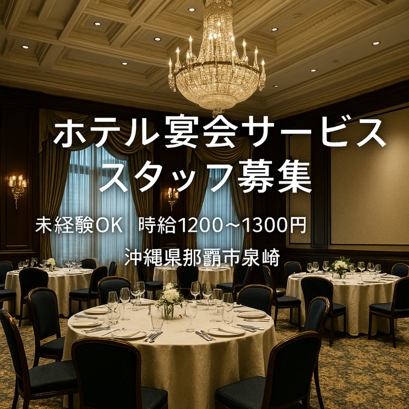 仕事内容 【PR本文】 ホテル内宴会場スタッフ募集! 未経験からスタートしたスタッフが多数活躍中。 しっかり研修があるので安心して始められます。 ✔未経験OK ✔高時給×手当充実 ✔20〜40代活躍中 ✔残業少なめ・シフト相談OK 「ホテルで働いてみたい」「接客が好き」そんな方にぴったりです! 【勤務地】 沖縄ハーバービューホテル(那覇市) 【仕事内容】 ホテル内宴会場でのホールサービス業務をお任せします。 <研修期間(約3ヶ月)> ・洋食フルコース/大皿料理の配膳 ・ドリンク作成・提供 ・宴会場のセッティング ・グラス・食器準備、拭き上げ ・片付け、翌日会場の準備 <1日の流れ(例)> 09:00 出勤・ミーティング/会場設営 10:30 休憩 11:30〜14:30 宴会(サービス対応) 14:30〜17:30 翌日セット 17:30 退勤 <研修後> ・宴会場サービスリーダー業務 ・スタッフ指示出し ・会場設営業務 【ここがポイント】 ・未経験からできる! ・ホテルならではのマナーが身につく ・接客スキルUP ・チームで働く安心の環境
