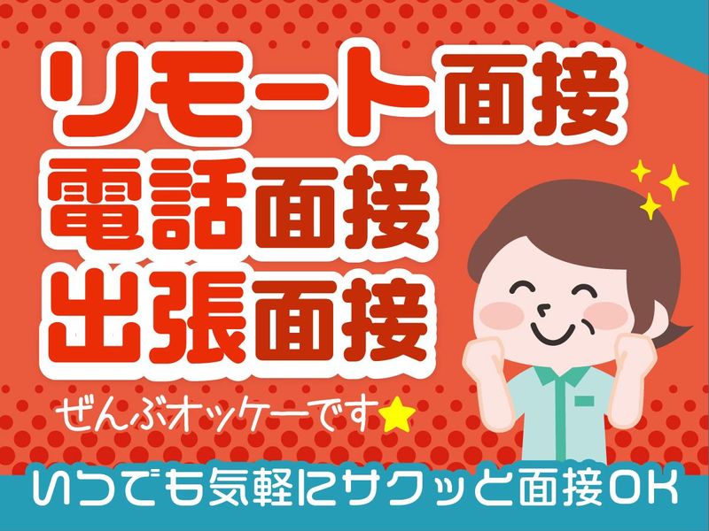 選考プロセス 「応募画面へ進む」ボタンより 必要事項を入力の上、送信して下さい お電話での応募も受け付けております 「求人を見た」と言って頂けると スムーズにお繋ぎすることができます。 繋がりにくい時はお手数ですが、 再度おかけ直しください。 応募したいけど、少し遠い…。 そんな方にも電話面接や出張面接、 WEB面接もあるのですぐに面接可能! 他にも、履歴書不要なので応募も簡単♪ 応募したその日に面接もOK◎ お気軽にお問合せ下さい!