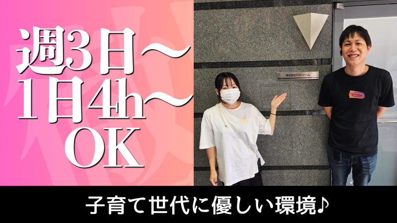 勤務時間詳細 ⏰9:00~18:00 ⭐週3日~OK! ⭐1日4時間~OK! ⌚休憩スタイル選べます!  ̄ ̄ ̄ ̄ ̄ ̄ ̄ ̄ ̄ ̄ ̄ ̄ ̄ ̄ 「集中して短時間で働きたい」も 「しっかり休憩をとりながら 長めに働きたい」もどちらもOK! 以下のように、勤務スタイルに 応じて休憩の取り方を選べます。 ▼お昼休憩なし(計70分/7時間50分勤務)  ̄ ̄ ̄ ̄ ̄ ̄ ̄ ̄ ̄ ̄ ̄ ̄ ̄ ̄ ̄ ̄ ̄ ̄ ̄ 10:20~10:30 12:00~12:10 13:00~13:10 14:00~14:10 15:00~15:10 16:00~16:10 17:00~17:10 ▼お昼休憩あり(計120分/7時間10分勤務)  ̄ ̄ ̄ ̄ ̄ ̄ ̄ ̄ ̄ ̄ ̄ ̄ ̄ ̄ ̄ ̄ ̄ ̄ ̄ 10:20~10:30 12:00~13:00(昼休憩) 13:00~13:10 14:00~14:10 15:00~15:10 16:00~16:10 17:00~17:10 どちらも選択可能なので、 自分の集中力や働き方に合わせて 調整できます! 「短時間で効率よく」 「ゆとりを持って1日しっかり」 …あなたらしい働き方を応援します♪