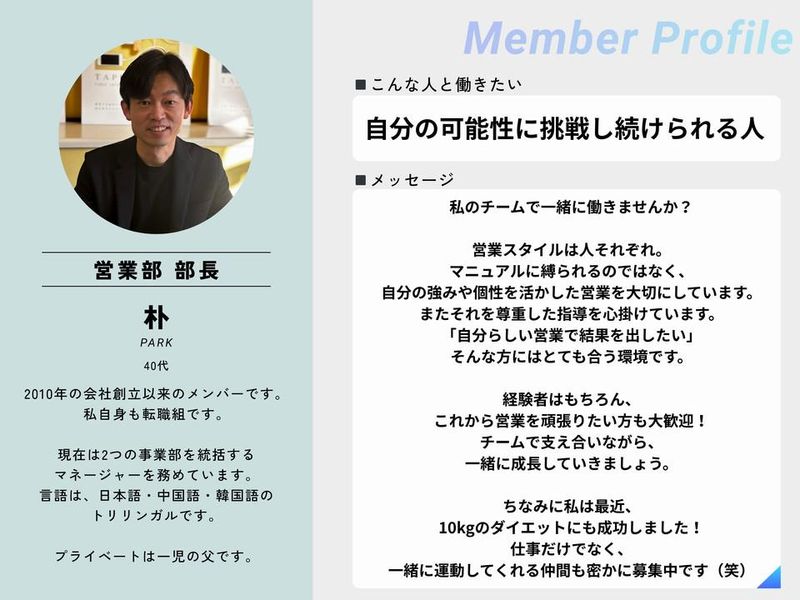求めている人材 学歴・資格不問 *PC基本操作(Word・Excel・タイピング等) *営業経験者(商社での勤務経験や光ケーブル・有形商材等の営業経験ある方尚歓迎) <こんな方にピッタリ> *オンオフめりはりをつけて生産性ある働き方がしたい *仕事を通じてキャリアを磨きたい *グローバルな環境で働きたい *ワークワイフバランスを大切にしたい *頑張りが評価される環境で働きたい <働く環境・チームの雰囲気> 社内共通言語は日本語です。出身国や前職など異なるバックグラウンドの社員が在籍中。一般的に営業は「ノルマ」「目標」に追われ殺伐としているように思われがちですが、弊社は各々がどうありたいか、を考えてお客様と向き合う姿勢を大切にしているため、今ある課題にどう向き合うか、を考える相談会のような雰囲気で話し合いをすることもしばしば。一緒に働くメンバーは仕事仲間でありながら、訪れる人生の転機も相談したり乗り越えたり喜んだりする存在です。