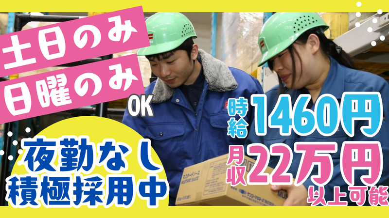 仕事内容 【土日祝限定勤務も積極採用!】 土日のみや日曜のみもOK!! ライフスタイルを変えずに働ける 日勤軽作業のお仕事! ★未経験の方も大丈夫です★ シンプルなコツコツ作業。 軽作業未経験の方も大歓迎!  ̄V ̄ ̄ ̄ ̄ ̄ ̄ ̄ ̄ ̄ ̄ ̄ ̄ ̄ ̄ ̄ ̄ ̄ 冷凍商品のケースピッキング、 段ボールを台車へ乗せ、 店舗ごとに仕分けをお願いします! 倉庫内作業未経験の方も大歓迎! 先輩が優しく丁寧に教えていくので、 未経験の方でも安心してスタート可能◎ 主婦(夫)さん・フリーターさん、 土日限定の学生さん、 Wワーカーさんなどなど、 みなさん大歓迎です*。٩(ˊᗜˋ*)و*。 ◤ ̄ ̄ ̄ ̄ ̄ ̄ ̄ ̄ ̄◥ お電話でのご応募も歓迎 ☎/047-431-8151 ◣_________◢ 職場見学も受付中! お気軽にお問い合わせください!  ̄V ̄ ̄ ̄ ̄ ̄ ̄ ̄ ̄ ̄ ̄ ̄ ̄ ̄ ̄ ̄ ̄ ̄ 「どんな風に実際働くのか気になる」 「職場の雰囲気を知っておきたい!」 長く続けたいからこそ、 働く職場って気になりますよね…! ですが、そんな方もご安心ください! 職場見学も随時受け付けておりますので お気軽にご相談くださいね。 常に安定しているフジパングループでの お仕事になるので、長く続けたい方や 腰をすえて働きたい方も歓迎です! もちろん業務未経験でも大丈夫です! 経験者も大歓迎!  ̄V ̄ ̄ ̄ ̄ ̄ ̄ ̄ ̄ ̄ ̄ ̄ ̄ ̄ ̄ ̄ ̄ ̄ 現在働いているスタッフのほとんどが、 未経験から始めています! 20代/30代/40代/50代と 幅広い年齢の男女スタッフが 活躍していますが、 みなさん気を遣うことなく 楽しくお仕事していますよ☆ 新人さんにも優しいので、 緊張しなくて大丈夫です! 先輩からのメッセージ(27歳・男性)  ̄V ̄ ̄ ̄ ̄ ̄ ̄ ̄ ̄ ̄ ̄ ̄ ̄ ̄ ̄ ̄ ̄ ̄ 前職も同様の仕事をしていましたが、 夜勤と日勤の交代勤務で 生活リズムが乱れてしまっていたので 転職を決意しました。 最初は慣れない事もあり不安でしたが、 研修が丁寧ですぐに 職場に馴染むことができました♪ わからないところはそのままにしないで スグに先輩に聞ける環境なので、 凄く助かっています! また前職の時と比べて、 時給が高い所も気に入っています。
