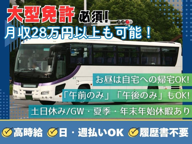 求めている人材 ✱人柄重視で採用!✱ ✨ブランク明けの勤務も大歓迎! <必須条件> ⏩要大型免許 <歓迎条件> ⏩企業送迎の経験者 ⏩大型バスの送迎経験者 「免許はあるけど送迎経験はない…」 そんな方も大歓迎です!! <こんな方にピッタリ!> ◎定年退職後の働き口として! ◎自分の経験・資格を活かしたい! ◎まだまだ社会で働きたい! ・…━━━☆・…━━━☆・…━━━☆ ✅経験者歓迎 ✅学歴不問 ✅フリーター歓迎 ✅ブランクOK ✅男性活躍中 ✅ミドル活躍中 ・…━━━☆・…━━━☆・…━━━☆ ✨こんな経験も活かせます♪ 幼稚園バス、マイクロバス、送迎運転手 観光バス運転手、送迎ドライバー バス運転士、バスドライバー 大型トラック運転手、配送ドライバー etc...当てはまる方も大歓迎です! ・…━━━☆・…━━━☆・…━━━☆
