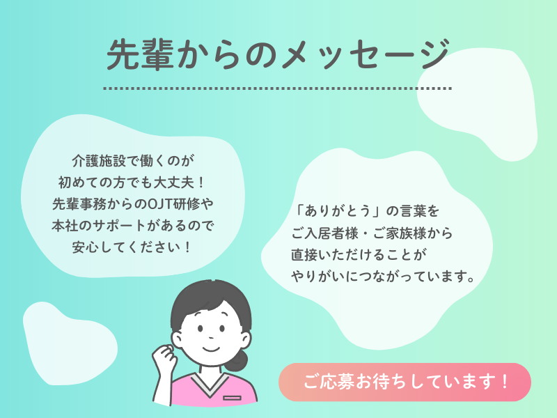 求めている人材 \\20代・30代・40代活躍中!// 【必須】 ◆事務職の経験がある方 ◆PCの基本操作ができる方 ・Wordを使用した文書作成 ・Excelへのデータ入力 ・社内・社外へのメールやりとり など >>以下にあてはまる方、大歓迎です! - ■入居者様、ご家族に寄り添える方 ■職場内でコミュニケーションをとり 仕事を進めていける方。 ■医療や介護の現場で働くことに 興味がある方