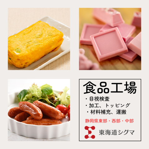 段ボールに梱包されている冷凍肉を箱から取り出し、棚に乗せる作業 ≪このお仕事のここがポイント≫ ★専属勤務なので自分に合った働き方を選べる ★一度は手にした事がある有名な食品の製造に携われる ★国道から近いので通勤しやすく便利 ≪東海道シグマで働く!ここがポイント≫ 東海道シグマでは、働くスタッフさんに優しい福利厚生を沢山ご用意しています。 静岡県外からのUターンやIターン希望の方も! 仕事と生活面を両方サポート致しますのでご安心ください。