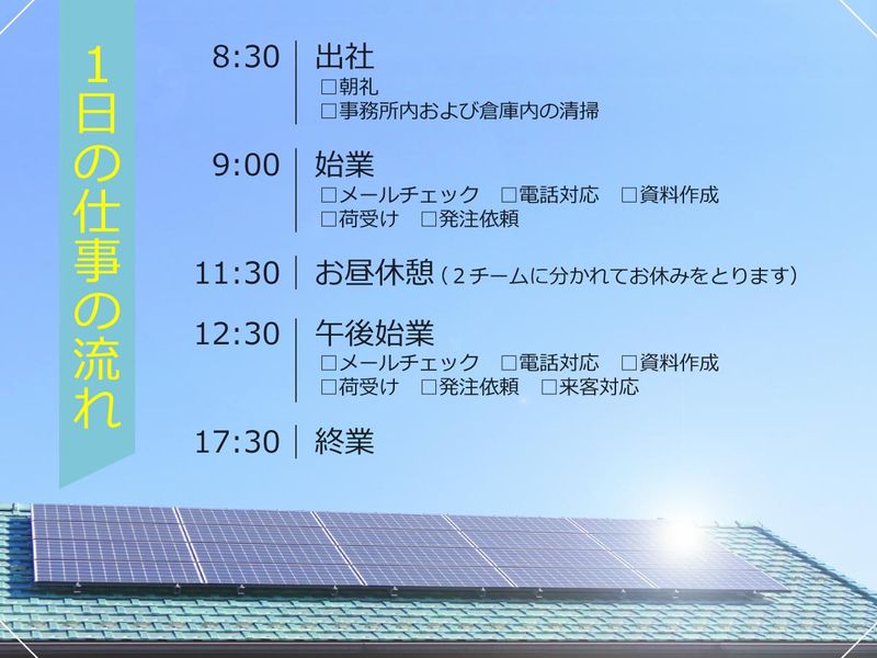 仕事内容 \\この求人のおススメPOINT// ✅土日祝休み!年間休日125日!長期休暇有 ✅昇給有/賞与年2回!/安定安心の会社! ✅髪型・髪色自由、ネイルもOK! ✅風通しの良さが自慢!笑い声が飛び交う楽しい職場です! <<当社の縁の下の力持ち>> *正社員×事務募集* 今回は増員募集になります! 【具体的には】 *電話対応 *見積書の作成 *申請業務 *エクセルやワードでのデータ入力など 【✨先輩社員にインタビュー♪】 <20代女性> 勤務地が家から近く、職場の雰囲気が良い会社で働きたいと思い 転職しました。 ぜひ当社へお越しいただければわかると思いますが、 本当にスタッフ同士協力的で仲良く仕事をしています! 髪型髪色自由でおしゃれをできるのは嬉しいです♪ 【共伸興建について】 産業用太陽光発電・蓄電池システムをはじめ、 個人様向けに太陽光発電・蓄電池・IH・オール電化などの ご提案から施工、アフターメンテナンスまでを行っている会社です。 創業45年以上!累計10000施工! 東証一部(プライム)上場企業との安定取引があり、安定感は抜群です。 太陽光業界の老舗企業として業績は毎年右肩上がり! 腰を据えて長く活躍したい方にピッタリです!
