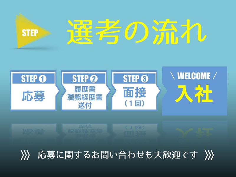 選考プロセス 充足になり次第、応募終了となります! ~~~~~~~~~~~~~~~~~~ 求人票だけでは伝わらないところからお話しできればと思います! ・今後のお給料は? ・ライフワークバランスはとれるの? 興味本位でも大丈夫です! お気軽にご応募いただければと思います! ~~~~~~~~~~~~~~~~~~ 【応募後の流れ】 ・応募 ・面接日希望日の返信 ・面接 ・7日以内に合否通知