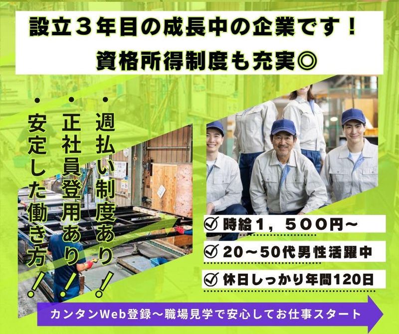 仕事内容 ー安定した働き方&キャリアアップを目指せるチャンス!ー 20~40代の男性が中心の急成長企業です。 大手住宅メーカーの外壁加工業務を手掛ける当社で、未経験からでも安心してスタートできます! 主な業務内容: ・住宅の外壁加工(ねじ止め・カット・検査など) ・施設内での製品運搬(フォークリフト資格者優遇 ※資格支援制度もあり) 現在設立3年目で従業員も拡大中の地元に密着した企業になります。 未経験・中途採用がほとんどなのでキャリアも気にせずスタートできる! 社長と従業員同士の距離も近く、社内懇親会(BBQ・バス旅行など)で良好なコミュニケーション活動をとっている職場です。 詳しい職場情報については担当よりご案内いたします。 まずはお気軽にご応募・ご登録お待ちしております◎