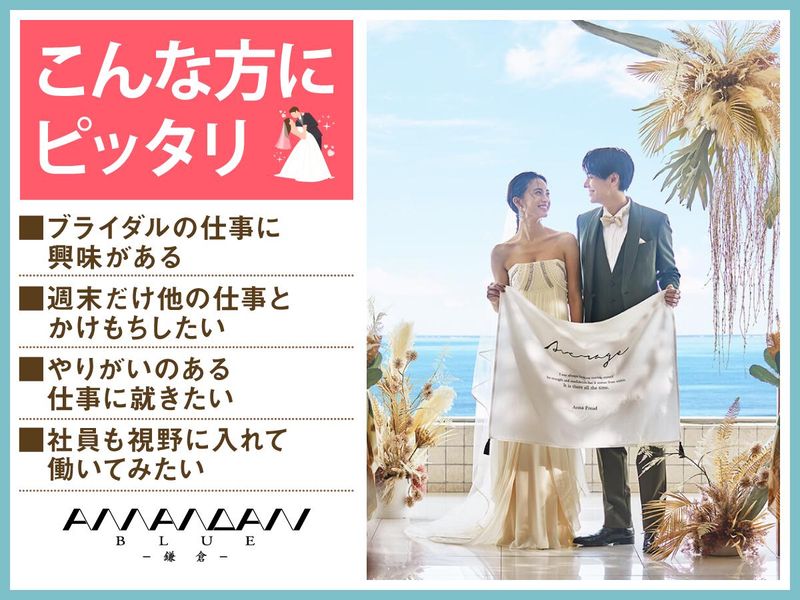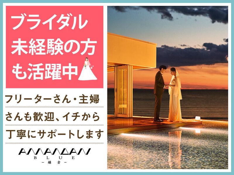 仕事内容 *湘南の由比ヶ浜を一望できる結婚式場* 感動いっぱいの結婚式を一緒にサポート♪ 週1~の柔軟シフトでWワーク・副業OK! フリーター・主婦パートさんも活躍中♪ 「人が喜ぶ姿が好き」「サプライズが好き」 という方必見!スキルや経験は一切不要♪ 一緒に素敵な結婚式を演出しましょう* アマンダンブルー鎌倉は 湘南エリアを一望する由比ヶ浜にある、 きらめく海に包まれた全席オーシャンビューの結婚式場。 ウェディングのお手伝いをするお仕事です◎ <主なお仕事内容は…> 結婚式場スタッフとして 次のお仕事をお任せ! ■会場の準備 ■お客様の上着や荷物のお預かり ■お席のご案内 ■結婚式のお料理・ドリンク提供 ※キッチン業務はありません◎ ―――――――――――――――― フリーターさんに オススメのポイントはこちら★★ ―――――――――――――――― ・週1日~1日4.5時間~OKで融通◎ ・本業が休みの土日だけ等大歓迎! ・かけもち・副業OK! ・絶品のまかないアリ(^^) まかないは本格料理人たちが 美味しい食材を使って作ってくれます♪♪ 現在はアルバイト・パート28名が活躍しています! 学生22名、40代主婦5名、フリーター1名が在籍中! 主婦さんの中には、 「子育てが落ち着いて時間ができたなら、 やりがいのある楽しい仕事がしたい!」 という理由で応募された方もいらっしゃいます♪ ―――――――――――――――― 特別な1日をサポートするお仕事 具体的な仕事の流れは? ―――――――――――――――― ▶STEP.1 ミーティング 披露宴の流れやお料理について スタッフ間で事前に確認して 式中にバタバタしないようにします◎ ▶▶STEP.2 披露宴会場の準備 お席に置く名札や ゲストの方に渡す引き出物を確認したり グラスを磨いたりして準備します。 ▶▶▶STEP.3 お客さまのお出迎え 荷物をお預かりし、 待合室でドリンクをお出しします! ▶▶▶▶STEP.4 ホール業務 お席にご案内し、順番にお料理や ドリンクを提供します◎ ―――――――――――――――― 未経験者歓迎! みんなで助け合う雰囲気です ―――――――――――――――― 最初は結婚式の見学からスタート! 見学後は本番じゃないところで、 研修を実施します◎ 「ブライダル業界は初めて」 「子育てでブランクがあって不安」 そんな方もご安心ください。 不安がなくなるまで、 スタッフ全員でサポートします◎