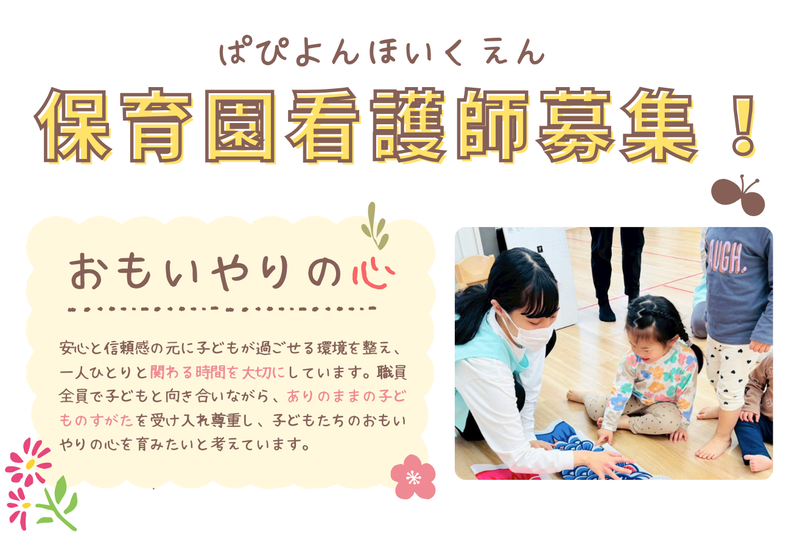 仕事内容 *企業主導型保育園 ぱぴよん保育園久留米* ┏ ──────────── ┓ 現在看護師さん募集★ ┗ ──────────── ┛ 保育園の看護師さん♪ 体調不良児の対応や 検診の対応もお任せします〇 託児所完備など、ご家庭をお持ちの方も働きやすい園です! 働きやすさ◎ここがポイント♪ ━━━━━━━━━━━━━━━━━ *定員は24名! *開園時間は7:30~18:30 ※延長保育19:30 *住宅手当などの各種手当が充実! ※社内規定あり 持ち帰り業務もありませんので、 ライフスタイルバランスの取りやすさもポイント♪ 当園の魅力ついて ━━━━━━━━━━━━━━━━━ 当園は、一人ひとりに寄り添った 無理のない保育を行っております。 木の温もりあふれる園内は、 ワンフロアで職員の目が行き届く 工夫がされています。木の温もりを感じ 『自然に触れ合う環境』でのびのび育ち、 教育・食育・色育・飼育など『育み』 ながら想像力を豊かに成長していく。 絵本を通じ、好奇心、聴く力、集中力、 感受性を豊かにし、子どもらしさと 知性を磨く保育園です。 小規模保育のメリット ━━━━━━━━━━━━━━━━━ 子どもたちには担任職員がつきますが ワンフロアになるので、職員全員で 子どもたちを見守れる環境になって いるので安心です★ *現在スタッフ10名 (調理・事務スタッフさん含めて) 現在活躍中のスタッフが ぱぴよん保育園を選んだ理由を聞いちゃいました♪ ━━━━━━━━━━━━━━━━━ 約6年病棟勤務をしていた中で、 成功体験を感じること、乳幼児期における 愛着形成の重要性について実感し 子どもや家族との関わりの際には大切にしてきました。 自身が大切にしている関わりができ、 さらにこども達やご家族と じっくりと関わることのできる職場で働きたいと思い 入社に至りました。 <入社後の流れ> ━━━━━━━━━━━━━━━━━ 入社 ▼ まずは当園の1日の流れを お教えいたします。 園の年間や季節行事などを含め、 1か月間の流れ、1年間の流れと スケジュールを覚えていただきます。 ▼ 先輩について補佐業務から 始めていきます。  ̄ ̄ ̄ ̄ ̄ ̄ ̄ ̄ ̄ ̄ ̄ ̄ ̄ ̄ ̄ ̄ ̄ ̄ <久留米・保育士/看護師さんの1日(例)> 7:30 出勤/園児出迎え 9:30 朝おやつ・朝の会 10:00 活動 11:00 給食 12:00 午睡 12:30 休憩 15:00 おやつ 15:45 帰りの会 16:00 お見送り/作業・デスクワーク 18:30 退勤(通常保育の場合) 19:30 退勤(延長保育時) ※上記時間内でシフト制の勤務となります。 ※1日4~5時間、週4~5日程度 体調不良児の対応や検診対応もお任せします! 仕事内容や勤務体制についてお気軽にお問合せください♪