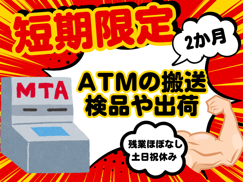 仕事内容 お急ぎの方はこちらにお電話ください! ▶ 090-6594-9375(担当携帯) SMSでの問い合わせもOKです◎ ‥‥‥‥‥‥‥‥‥‥‥‥‥‥‥‥‥‥‥ ━━━━━━━━━━━━━━━ 期間を区切ってサクッと稼ぐ! ━━━━━━━━━━━━━━━ ATM機の出荷準備&ンドリフトでの搬送! 【仕事内容】 ATM機を出荷するための準備をするお仕事です! といっても難しい作業はナシ。みんな未経験からスタートしてます♪ 具体的には… ・ATMの見た目やパーツのチェック(検品) ・ハンドリフトでの搬送作業 ・梱包・出荷の準備 など 多少、体力つかいますが…。でも、コツをつかめば意外とサクサクこなせます! 2ヶ月短期でまとまった資金をGETしちゃってください( *´艸`)