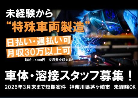 仕事内容 ★経験者歓迎/短期×高時給1,800円/冷暖房完備 「車いじりが好き」 「技術を活かして人の役に立ちたい」 そんなあなたにピッタリの仕事です。 ・。・。・。・。・。・。・。・。・。・。 ▼具体的な仕事内容▼ 介護・福祉の現場で使われる車両を (リフター・スロープ・回転シート付きなど) プラズマ溶断機や CO?半自動溶接機を使って 改造・カスタムする仕事です。 ・車体の一部をカットし、 骨格を溶接して補強 ・部品の取付・溶接・仕上げ・検査など ・電動工具を使った加工や修正対応 ★一品モノの車両改造だから、 自分の手で“形を作る”やりがいあり! ★先輩がマンツーマンでサポート 安全教育・資格支援あり ・。・。・。・。・。・。・。・。・。・。 ★こんな方におすすめ  ̄V ̄ ̄ ̄ ̄ ̄ ̄ ̄ ̄ ̄ ◇溶接・製造・車両整備など 経験を活かしたい方 ◇プラズマ・インパクトなど 工具作業が得意な方 ◇手順を丁寧に守り、 安全第一で作業できる方 ◇クルマ好きで モノづくりに興味がある方 ★勤務条件  ̄V ̄ ̄ ̄ ̄ ̄ ̄ ̄ ̄ ̄ ・期間:2025年11月~2026年3月末 (延長の可能性あり) ・時給:1,800円+交通費支給 ・時間:8:30~17:30 (実働8h/休憩1h) ・休日:土日休み (会社カレンダーによる) ・勤務地:神奈川県茅ヶ崎市 (寒川駅より車7分) ・通勤:マイカー通勤OK (駐車場あり/有料500円~) ★職場環境・魅力ポイント  ̄V ̄ ̄ ̄ ̄ ̄ ̄ ̄ ̄ ̄ ◇ 冷暖房完備の快適工場 ◇ 一品モノの溶接作業で スキルアップ! ◇ チームワークの良い職人達が多数在籍 ◇ 日払い・週払いOKで 急な出費にも安心♪ ================== 「技術を活かしたい」 「地元で安定して働きたい」 そんなあなたを応援します! まずは質問だけでもOK。 お気軽にご応募ください♪