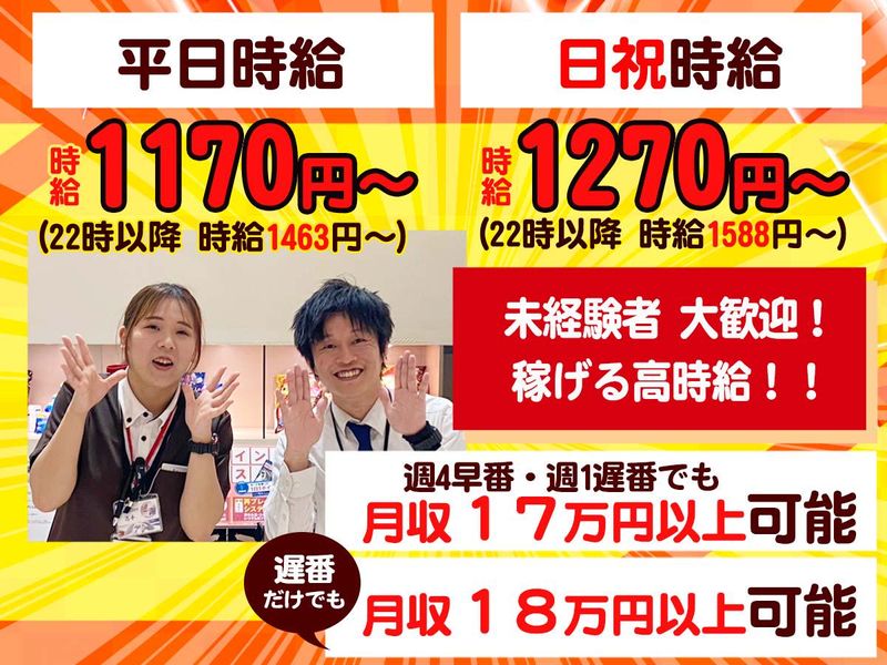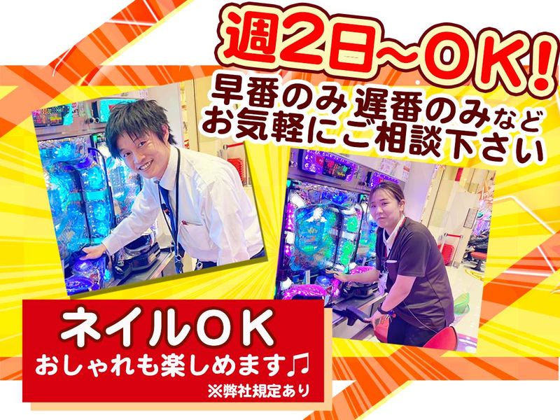 仕事内容 ⭐計数システム◎玉箱を運ぶ作業なし♪ ⭐高時給!日祝は1270円!! ⭐早番のみ遅番のみ等もご相談ください! ⭐履歴書は無くてもOK♪採用時提出でも可 ⭐未経験者歓迎♪スキル不要◎ ⭐オシャレしながら働ける★ ⭐20代~40代の女性スタッフ活躍中!! └制服はパンツスタイルで働きやすさ抜群 ⭐清潔感のあるキレイな店舗◎ =================== ✨最新システムの自動計数機を導入✨ └箱おろし作業など力仕事なし! └手を汚さなくて済む! └通路に玉箱がないので広々! =================== ✨お仕事内容 ――――――――――――――――――― ◆台数:パチンコ320台、スロット320台 ✅お客様の入店対応 └お客様が遊技を開始するサポート ✅遊技中のサポート └機械のトラブル対応 ✅清掃とメンテナンス └遊技台やホール内の清掃 └機械のメンテナンス まず初めに研修をマンツーマンで行い、 業務などをしっかり覚えられるので、 未経験の方でも安心ですよ。 \\ キレイな店内✨ // 設備をキレイに保っているので、お客様 からも「いつ来てもキレイだね」と 褒められます。 お客様が安心して楽しく遊んで頂ける空間 づくりを一緒に行いましょう!