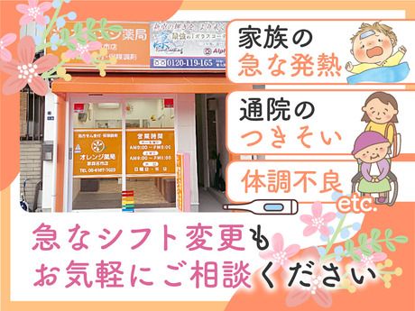 職場環境 【従業員構成】 <20代~50代の主婦パートさんが活躍中> 小さいお子さまのいる子育て真っ只中のママさん 子どもが大きくなって時間に余裕ができたママさん 家計の足しやお小遣い稼ぎに働くママさん キャリアアップを目指しているママさん いずれは正社員を目指しているママさん …など、いろんなパートさんがいます♪ <株式会社オレンジホールディングス> 地域のかかりつけ薬局として 全国に約140店舗の調剤薬局を 展開しています。