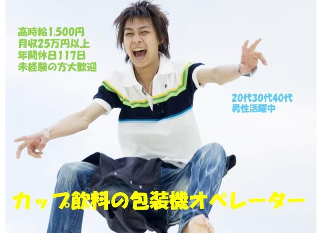 カップ飲料の包装機オペレーター 未経験者歓迎! モノづくりデビューを当社でしよう! 2交替勤務で稼げます! 適度に体を動かせるので、 飽きがこずに、モクモク作業ができます! ≪ポイント≫ □高時給! □嬉しい土日休み! □稼げる!月収25万円可能! □残業少なめ(0~10時間) □年間休日117日! □20代~40代の男性スタッフが活躍中! カップ飲料の製造を行う 工場でのお仕事を始めませんか。